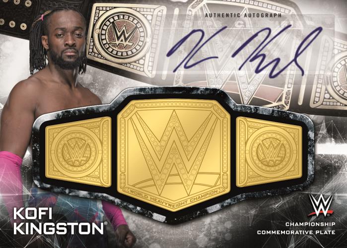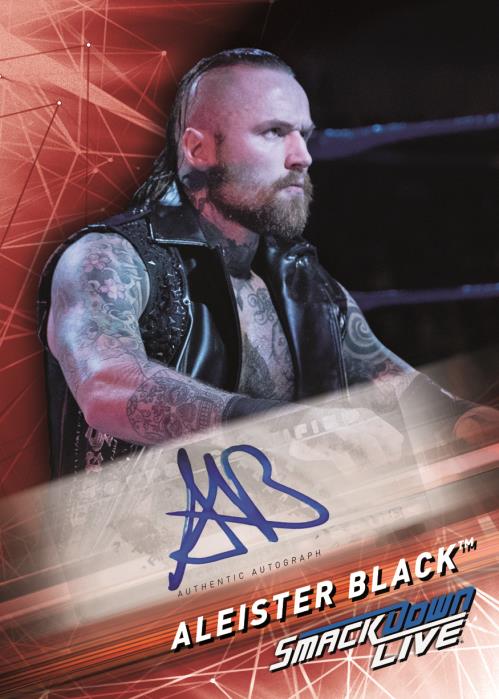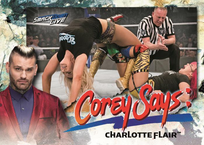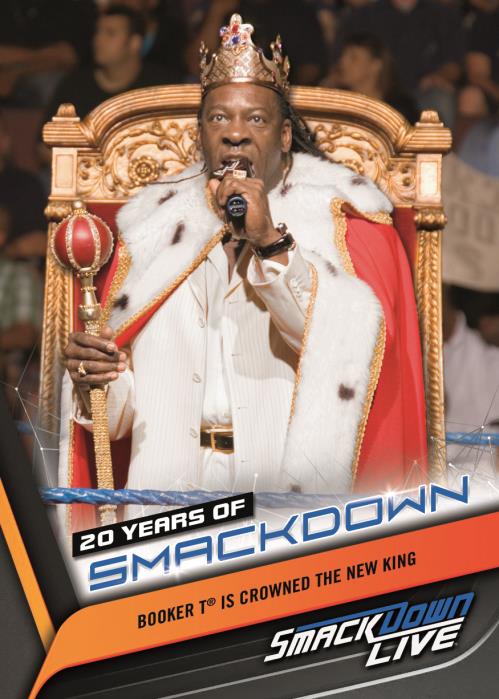 The Basics: The base set consists of 90 cards with Green (jumbo packs only), Purple (/99), 20th Anniversary stamp (/20), Gold (/10) and 1/1 Red and printing plates for parallels. There will be at least three insert sets in this one with 20 Years of Smackdown, Corey Says and the fourth and final part of a Ronda Rousey Spotlight set. The Says set will allow WWE announcer Corey Graves to look at performers' finishing moves. ... The autograph (/99) lineup will include men's and women's stars from the show and parallels will include Orange (/50), 20th Anniversary (/20), Gold (/10) and 1/1 Red. There also will be dual-auto cards (/25) with Gold (/10) and 1/1 Red versions -- and those same volumes will be used for triple-auto cards. ... The Relics will include Smackdown Championship cards (/299), Shirt Relics (/199) and Mat Relics (/199) with each having Purple (/99), Orange (/50), 2oth Anniversary (/20), Gold (/10) and 1/1 Red parallels. They'll also have autograph (/10) versions with 1/1 Red-auto versions, too. ... Last but not least, there also will be Tag Team Championship cards (/299) with the same parallels as the other Relics.