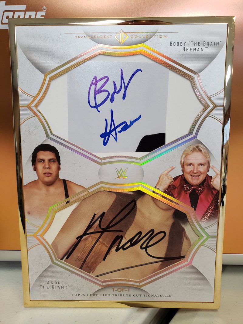 The Basics: Every box will include a set of 50 on-card autographs with one 1/1 auto guaranteed to be in the mix. There also will be one autographed kiss card, one cut auto or dual cut auto, one signed sketch card from popular WWE artist Rob Schamberger, one autographed replica WWE championship belt, one WrestleMania 35 ticket and a VIP/WM 35 party invitation. ... All framed autographs will be limited to no more than 25 copies and the roster of signers will include a few who have not signed for Topps before or only had limited card signings in the past such as "Stone Cold" Steve Austin and Paige. Auto parallels in this one will include Blue (/15), Purple (/10), Black (/5) and 1/1 Gold as well as 1/1 Red cards to chase. ... Autographed Kiss Cards will be limited to 10 with Black (/5) and 1/1 Gold and Red versions. ... Oversized cut autographs will include either one or two autos and they will be framed liked other Transcendent releases. Among them? Andre The Giant. ... The VIP party will be before WrestleMania 35 on April 7 in East Rutherford, N.J., and there will be WWE stars on hand and gift bags for all attendees.