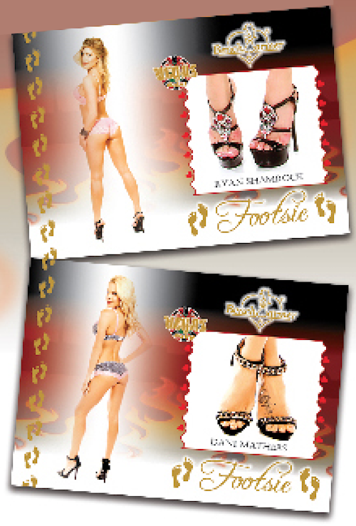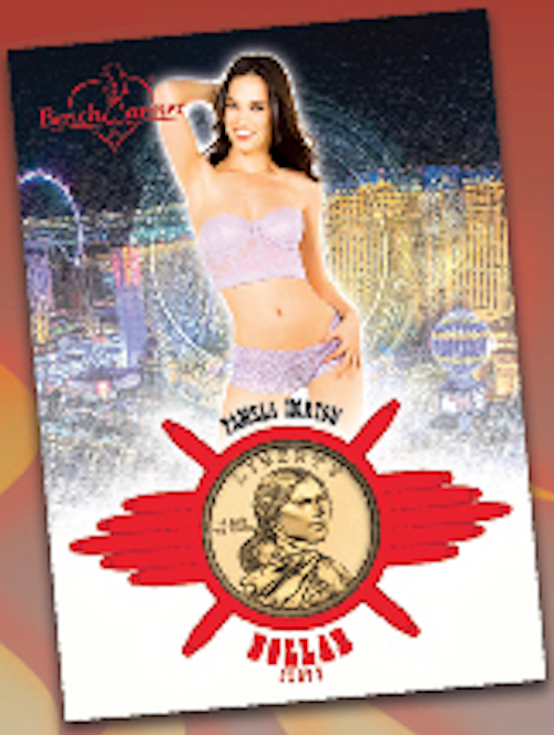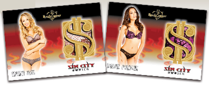 The Basics: Each box will include six hits from a selection of cardboard and a selection of premium base cards and inserts. Among the inserts will be Sportsbook, Butt Cards (one per box) and Footsie, while memorabilia cards will include Hair Cards, Dollar Slots (embedded coins), swatch cards, Heart Gems, Vegas Jewels and Bracelet cards. The last three will be 1/1 creations found three per case. ... No specific parallels were details but cards are seen with green, blue and red versions as seen here.