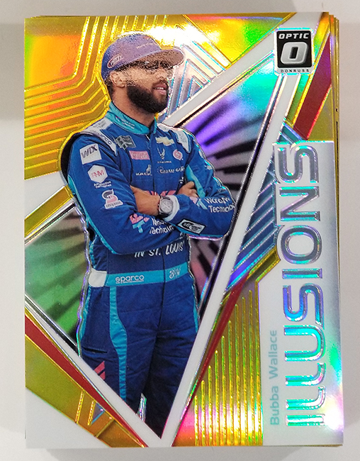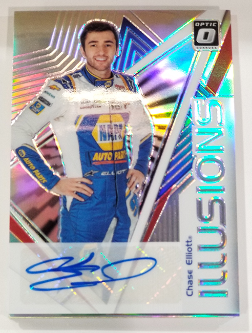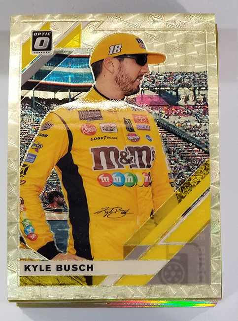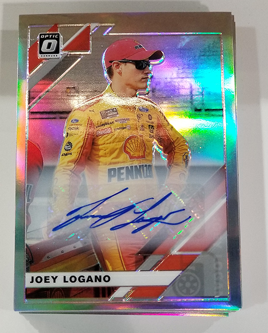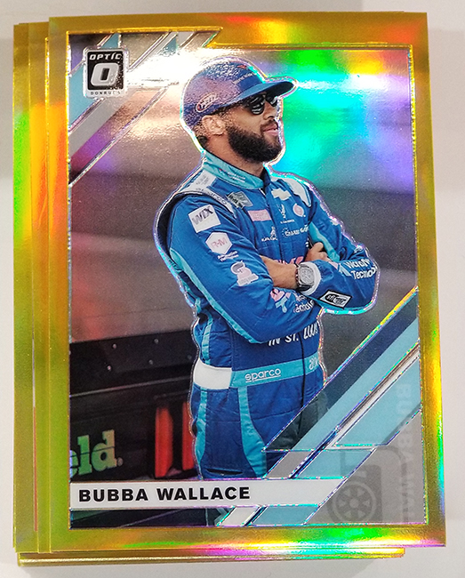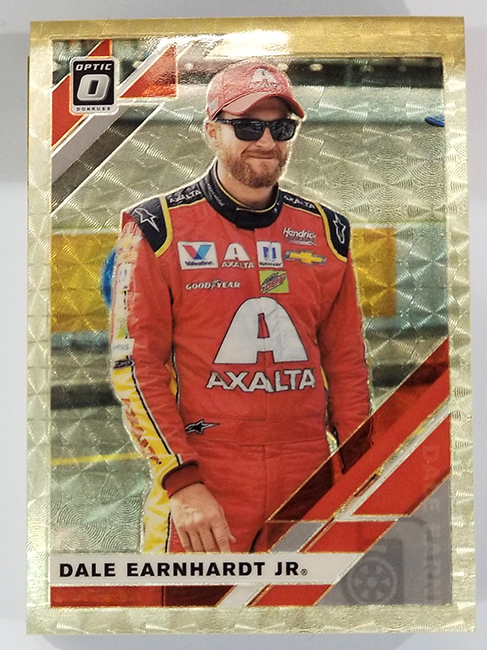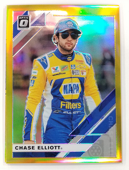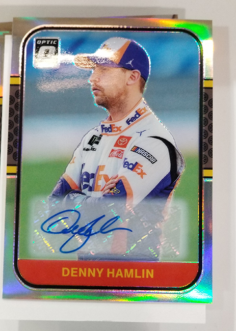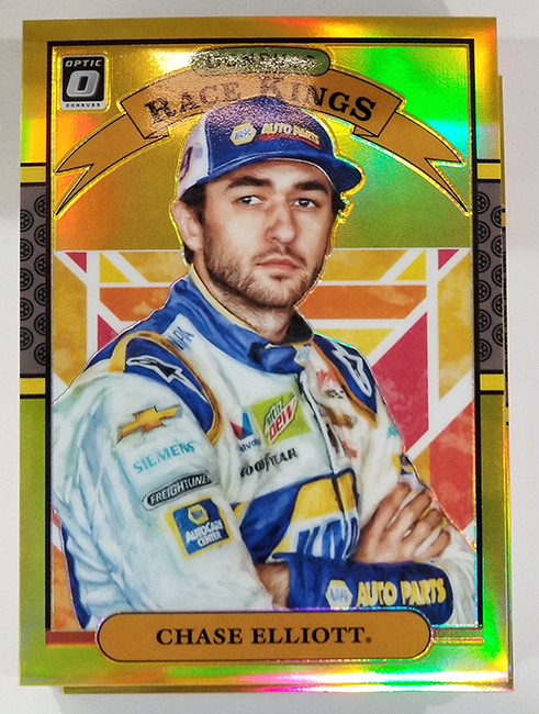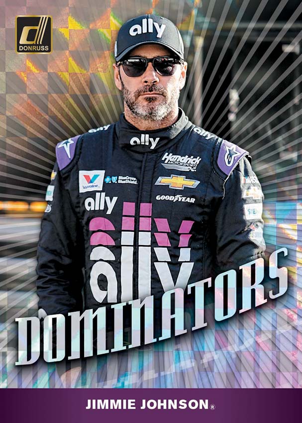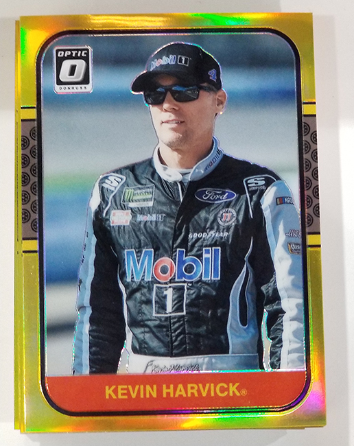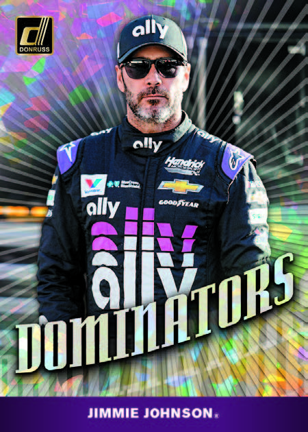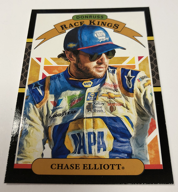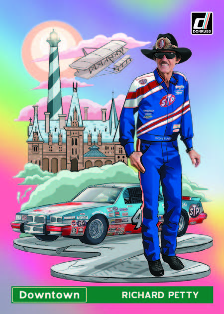 The Basics: Each hobby box will include 24 Optic insert cards -- double last year's total -- as well as 24 parallel cards and 24 insert cards atop the base cards and hits. ... There will be new parallels in the mix, including Red, Blue, Black Numbers, Green, Purple, Pink and Black Trophy Club for all 200 cards in the base set. It will include drivers, cars, Rated Rookies, Retro 1987, Race Kings and Retro 1987 Throwback Cars. The full parallel lineup will include nine parallels -- Silver parallels and printing plates are the others.... Meanwhile, new inserts and memorabilia will include Timeless Treasures Signatures and TT Materials Signatures, Downtown, Retro Series, Elite Series, Dominators, Action Packed, Aero Package and Retro 1987 Relics. ... Signature Series cards will be found for past and present drivers with three parallels this time -- Red, Gold and Black. Those same colors will apply for Timeless Treasures foil stamping as well as for the Race Day Relics cards that will have several possible swatches. Tires, sheet metal and firesuits will all be in play for that one. ... Dominators inserts will be hobby-only finds with three parallels -- Holographic, Cracked Ice and Xplosion. Also in play will be Downtown -- its NASCAR debut -- while Optic inserts will include base Optic, Optic Race Kings, Optic Rated Rookies, Optic Illusion and Optic Retro cards. There also will be Holo, Gold, Gold Vinyl and autograph parallels. ... Packs will once again carry a suggested retail price of $2.99.