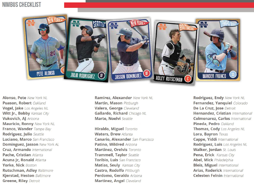 The Basics: Nimbus will have two on-card autos from a lineup that includes Ronald Acuña Jr., Jasson Dominguez, Wander Franco, Julio Rodriguez, Adley Rutschman, Carlos Colmenarez, Armando Cruz and Roderick Arias to name a few. Among the autographed parallels will be thick-stock Metallic Silver Border cards (/325) as well as Gold (/50), Black (/25) and Red (/5) and there also will be base card parallels considering preview images teased by the company. Also in play will be full-name autos, draft-year inscriptions and nicknames. You can see the checklist below and it also includes Pete Alonso, Bobby Witt Jr., Heston Kjerstad, Riley Greene and Bayron Lora among others.