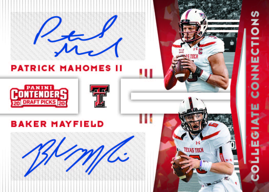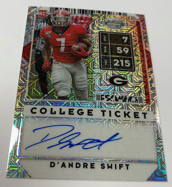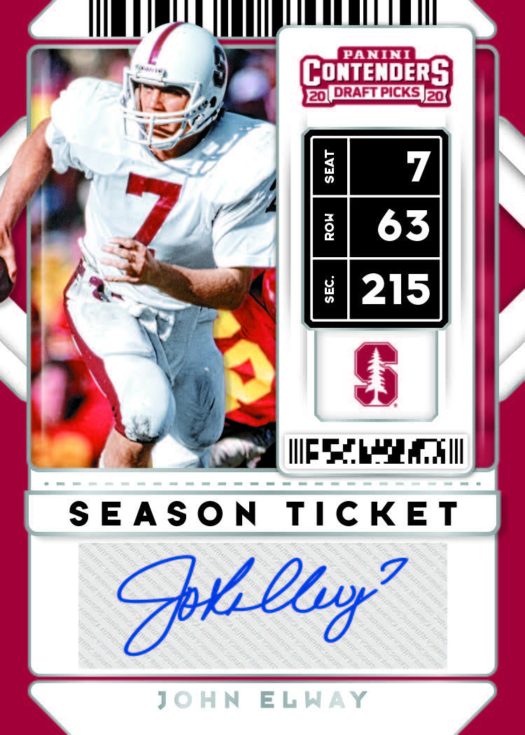 The Basics: The typical box of this one will include an auto in every pack and a meatier mix of 30 inserts or parallels along with a mix of base cards. The lineup is a familiar one that includes on-card ink for top prospects who sign on here. There also will be autos on the School Colors, Game Day Tickets and two-player Collegiate Connections cards. ... Also back will be Draft Tickets, College Tickets and parallels will include Bowl, Playoff, Championship, Cracked Ice, Fame, Diamond, Building Blocks and printing plate versions. ... Season Ticket autos also will include past greats like John Elway, Peyton Manning and Tim Tebow. ... These boxes (18-card packs) will carry a suggested retail price of $130.
