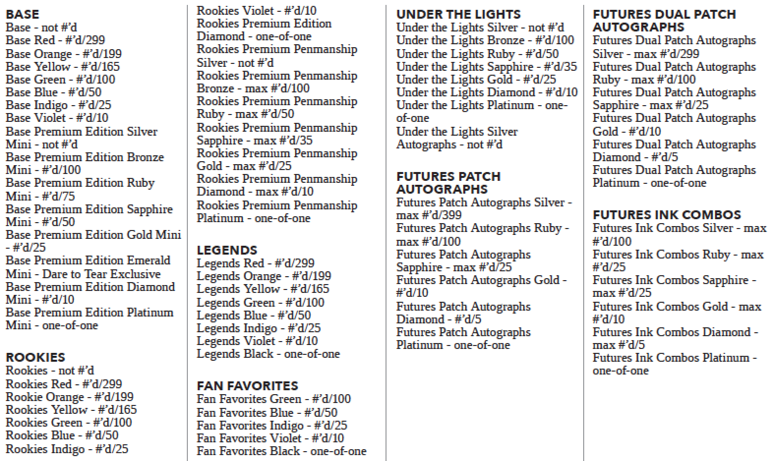 The Basics: There will be two Optichrome mini cards and four Optichrome cards per box here atop the hits and a selection of stuff from a 200-card base set as well as plenty more. The base set will include 100 veterans, 40 legends and 60 rookies each with parallels (see a full breakdown below). There will be rookie variations in the mix, too. (Last year's rookies are shown in the mocks here.) Also among the parallels will be autographs and Optichrome versions of base cards, while rookies will also have the same possibilities. ... For the insert cards, Dare to Tear parallel cards (above) will exclusive Emerald mini Optichrome parallels inside them. There also will be Under The Lights and Fan Favorites cards to be found. ... For autographs, there will be Under The Lights, Futures Patches, Futures Dual Patches and Futures Ink Combos in addition to rookie autos dubbed Premium Penmanship. ... These will once again carry a suggested retail price of $5 per pack or $80 per box.