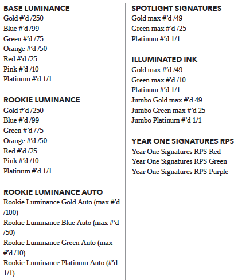 The Basics: Boxes of this one will include five parallels, four inserts and 12 Rookie Cards in a typical break atop the hits just like last year. ... The base set will have Gold (/250) Blue (/99), Green (/75), Orange (/50), Red (/25), Pink (/10) and 1/1 Platinum parallels for both veterans and rookies with numbers that are higher than last year. Other parallels of other inclusions can be seen detailed in the gallery below. Rookies will be seen in their college action moments (last year's rookies shown in the mocks). ... Also in play well be Spotlight Signatures, Illuminated Ink, Year One Signatures and Year One Dual Signatures. There will be rarer ink variations in play for those as well with Red, Green and Purple ink (/5 max) versions announced. For memorabilia fans, there will be Jumbo Prime cards. ... Joining the Jersey Swap insert cards will be Shining Stars, Rising, Jubliee and Moments. ... These once again will carry a suggested retail price of $30 per 10-card pack or $120 per box.