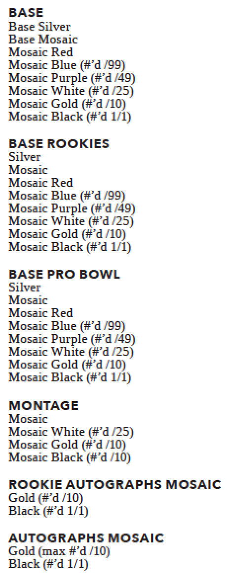 The Basics: Each box will include five Silver parallels, 15 more Mosaic parallels and 20 inserts atop the hits. Hobby boxes will be the only place to find inserts that include In it to Win it, Center Stage, Swagger, Stained Glass and Overdrive, while hobby-only ink will include Mosaic autos for rookies and veterans as well as rare Gold and Black parallels, too. ... For the 300-card base set, there will be a number of parallels -- see the gallery below -- while other inclusions will be Montage and Pro Bowl cards. ... Boxes will carry a suggested retail price of $120. ... Note: The Rookie Card mocks here use last year's standouts -- this year's rookies will be found in this release.