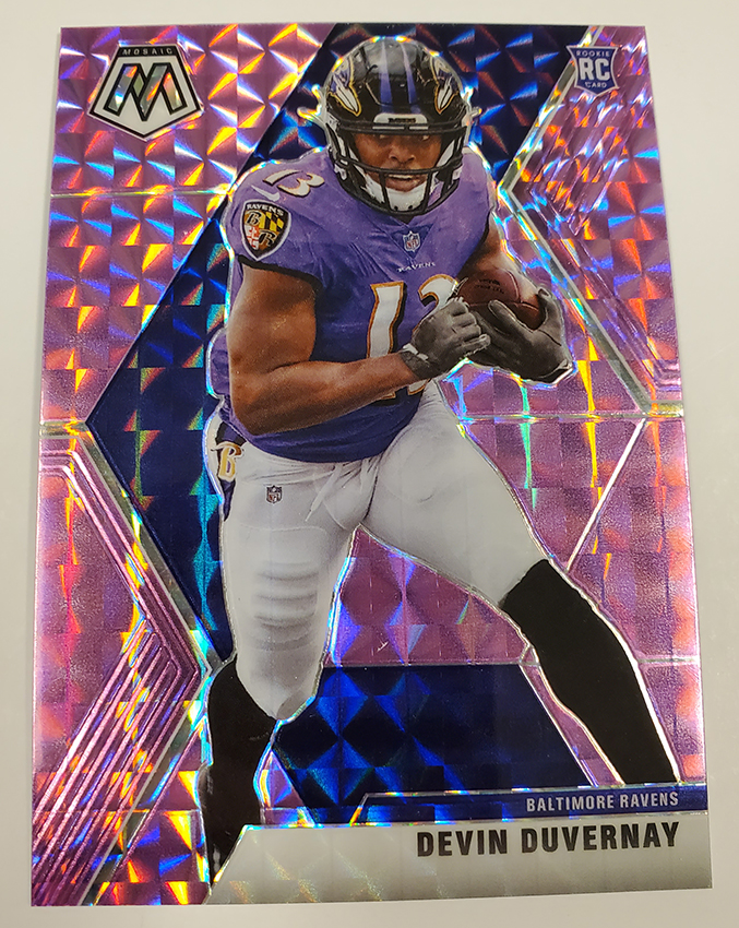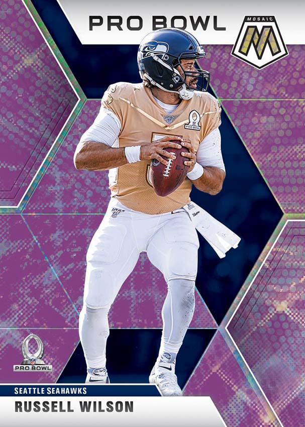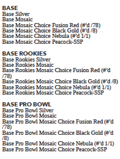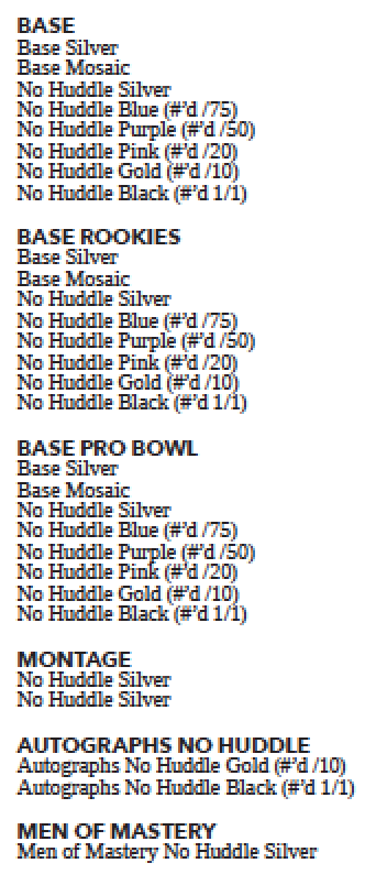 Update: There also will be Choice boxes for this release with eight cards per box (20 boxes per case) with each including one autograph, one Silver parallel, one Mosaic parallel, two Choice rookies and three exclusive Mosaic parallels. Among the finds will be parallels of the base and rookies only found in these boxes -- Red and Green, Fusion Red (/78), Black Gold (/8) and 1/1 Nebula cards. There will also be a short-printed Peacock parallel only found here. ... There also will be No Huddle boxes with the same box/case sizes but those will include their own texture/pattern with one auto, three Silver parallels, 10 No Huddle parallels, five inserts and one rookie variation No Huddle card. They will include No Huddle Silver, Blue (/75), Purple (/50), Pink (/20), Gold (/10) and 1/1 Black versions.
