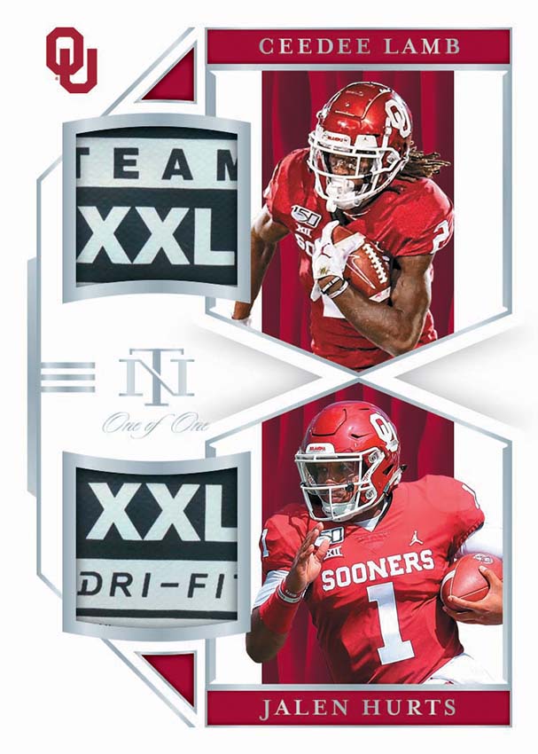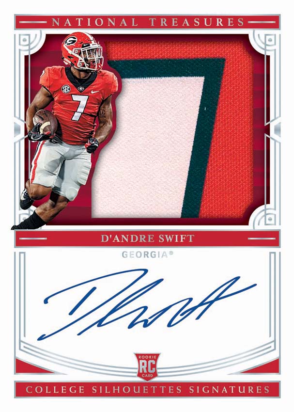 The Basics: There will be one base card or parallel per box along with one additional other card atop of the hits in each box. The base set will include 40 cards -- smaller than last year -- with each limited to 99 copies and each having six parallels and printing plates. ... The menu looks similar to past years and there will be on-card autos to chase in Team Logos College Materials Signatures, Notable Nicknames and Combo Player Signature Booklets among others. Also in the mix will be Silhouette Signatures, Dual Signatures, dual-swatch cards with laundry tags and other versions. Silhouettes and combo player books will include bowl, conference and championship logo patches as with past years. ... Boxes carry an increased suggested retail price of $425.