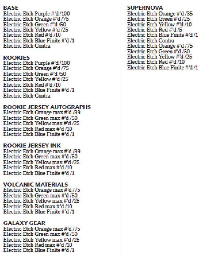 The Basics: There will be one base card and two inserts or parallels per box along with the hits. Found one per case will be Black Color Blast cards as well as Contra cards. ... The base set will consist of 100 cards with plenty of parallels (see gallery) with past and present stars included. Atop that, there will be 100 Rookie Cards that will also have autographed parallel versions in the mix. Among the hits will be rookie jersey autos, rookie jersey ink cards (multiple swatches), Matrix Material autos, Lightning Strike, Aurora autos, Volcanic Materials, Rookie Eruption and Galaxy Gear. ... Among the rarer inserts will be diecut Supernova cards as well as Tunnel Vision, Supernova and Vitreous as well as the previously mentioned Color Blast and Contra cards. ... Boxes carry a suggested retail price of $165.