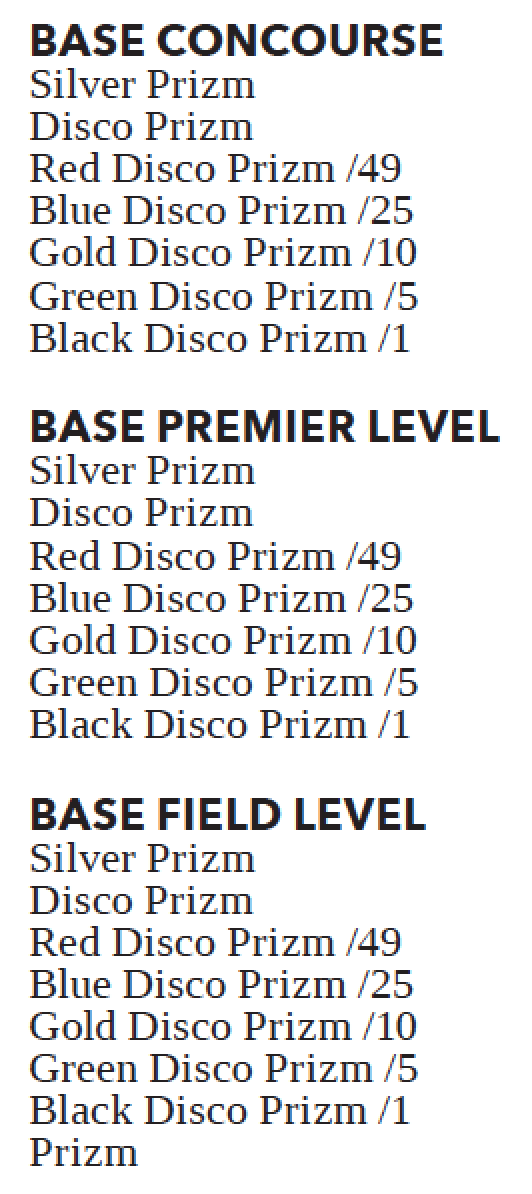 Update (Feb. 24): There will be H2 (Hobby Hybrid) boxes for this one with four six-card packs per box (20 per caee) with Disco cards the difference. There will be two Silver Prizms and four Disco Prizm cards per box along with two Disco autos per case. The base Disco parallels will include Disco, Red, Blue, Gold, Green and Black cards with their numbering noted in the gallery.