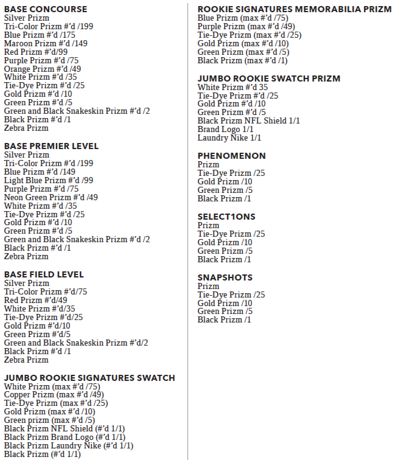 The Basics: Boxes will include 10 Silver Prizms, five other Prizms and six insert cards each time. The base set will include 400 cards with a number of parallels for each of its tiers -- Concourse, Premier Level, Club Level and Field Level. See the gallery for a full breakdown there. ... Among the hits will be jumbo rookie signature swatches, rookie signature memorabilia and jumbo rookie swatch cards for starters. For inserts, there will be Phenomenon, Select1ons, Rookie Selections and Snapshot cards. Select1ons are new with past No. 1 overall draft picks getting the focus. There also will once again be XRC cards for players taken in the 2021 NFL Draft. ... Boxes will carry an increased suggested retail price of $250 for this year (up from $150 last year).