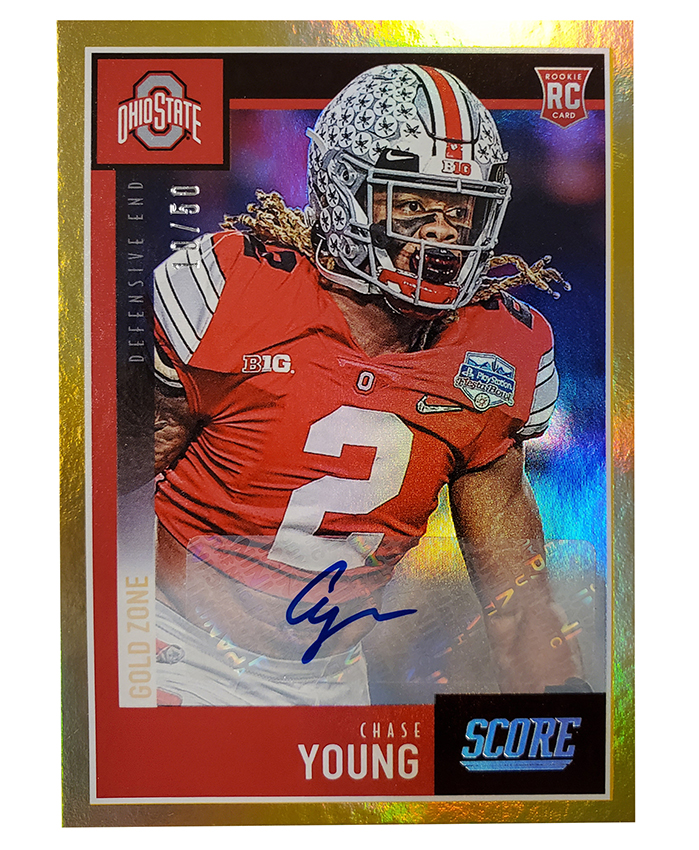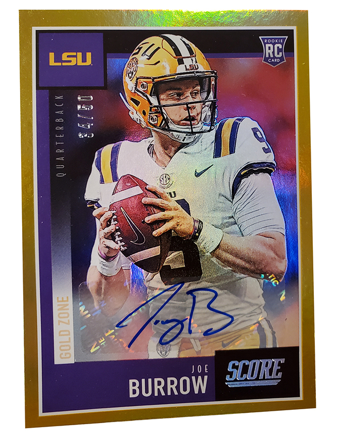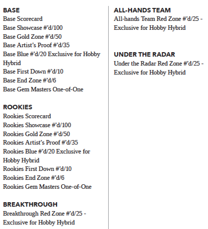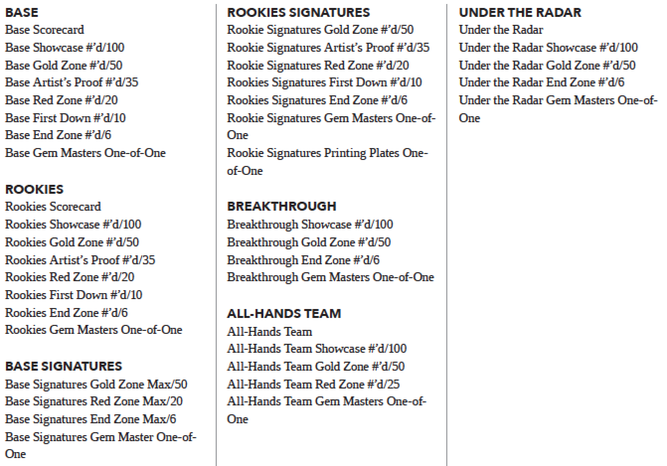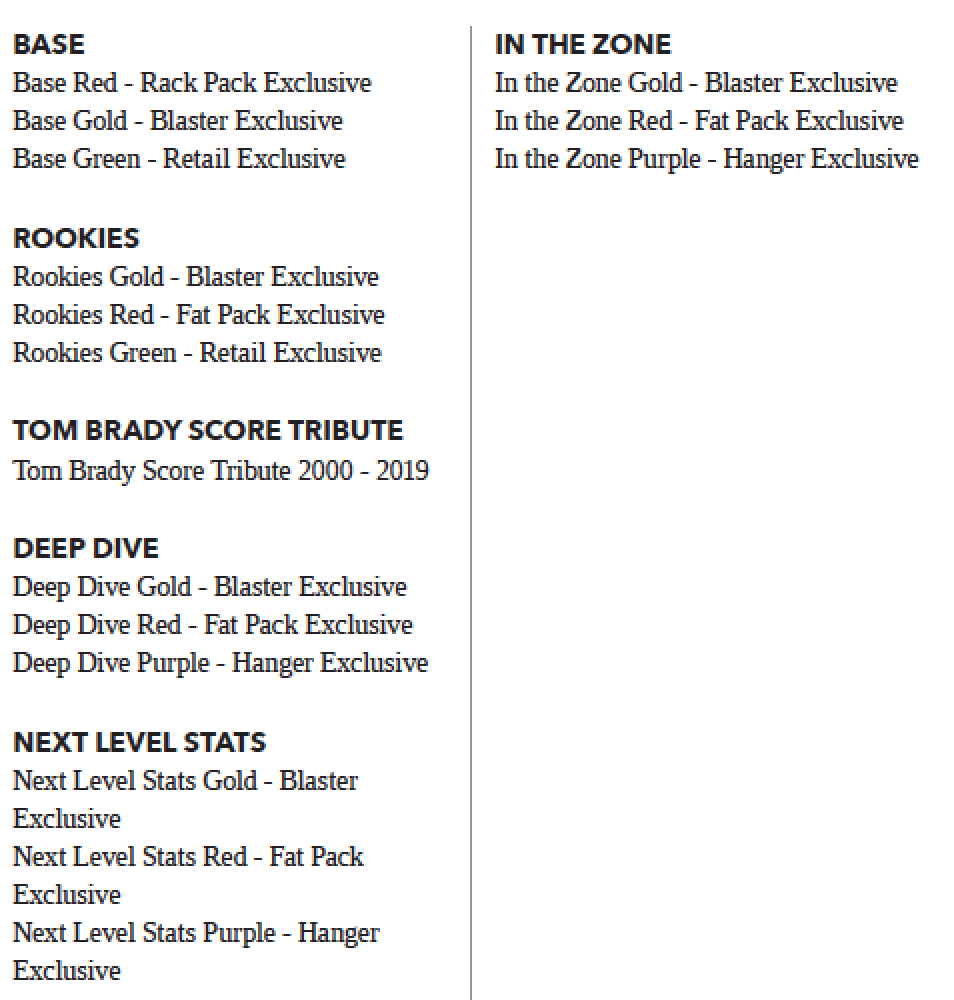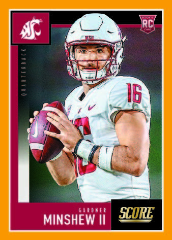 The Basics: There will be 40-card packs once again for this one with 90 Rookie Cards, 10 parallels and 36 inserts in a typical box. There will be 110 Rookie Cards in this edition -- the mocks here show last year's rookies -- with parallels that will include eight versions per card for both veterans and RCs. You can see a full breakdown in the gallery below. ... Autographs will be found for veterans as well as rookies, while one of the hobby-only inclusions will be Intergalactic inserts found one per case. Other inserts will include Breakthrough, All-Hands Team and Under The Radar. Also in play will be a Tom Brady Tribute with 20 years of his Score cards and ink involved. ... All will have parallels and no other inclusions were announced at this time. ... Packs will once again carry a suggested retail price of $10 ($100 per box).