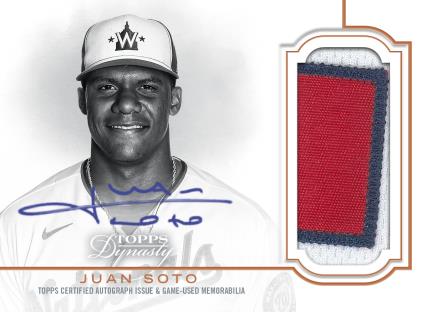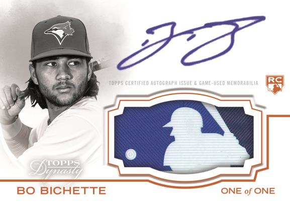 The Basics: Dynasty Autographed Patches will be limited to 10 copies per card with parallels limited to five copies and one copy. On This Day auto patches (/10) are back and will spotlight jersey pieces with MLB Authentication for key games and they'll have both the Silver (/5) and 1/1 Gold parallels. Other inclusions will be new triple-auto patch cards (/5) and dual-auto swatch legends cards (/5) as well as dual-auto patches (/5). Each will only have the 1/1 parallels. ... Also in the mix will be signed special-event baseball cards (/5) with 1/1 Gold versions having the ball swatches for the event logo. Joining them will be batting glove autos (/5) with 1/1 wrist straps and logo versions as well as MLB logo 1/1s for as many as 75 players. Also in there will be legendary dual autos (/5) with Silver (/3) and 1/1 Gold versions. Rounding things out will be two cut-auto sets -- 1/1 cuts and dual Relic cuts, which also will be 1/1 creations.