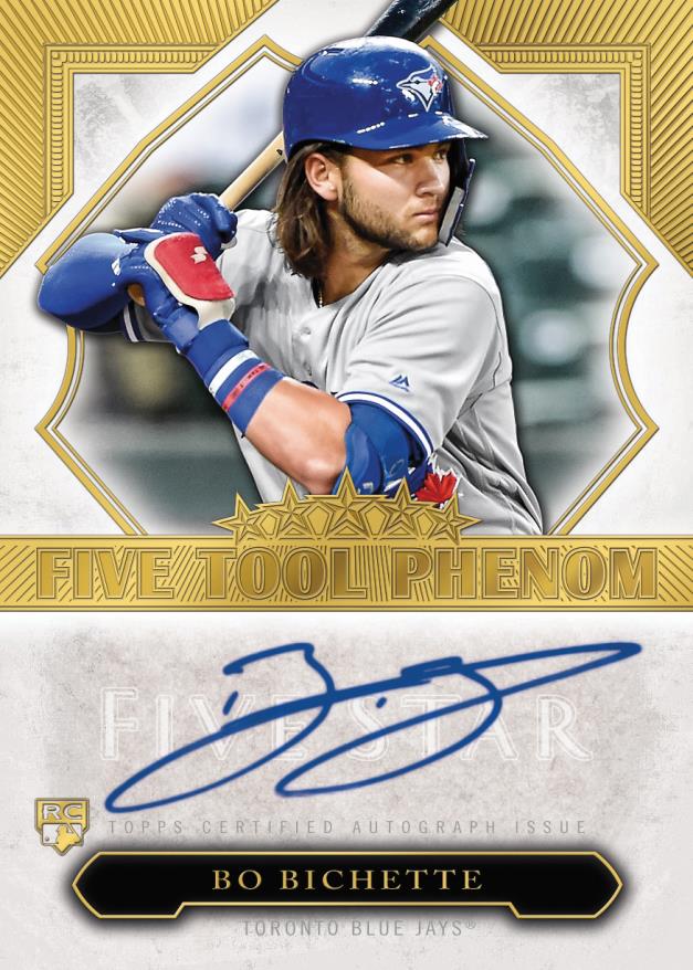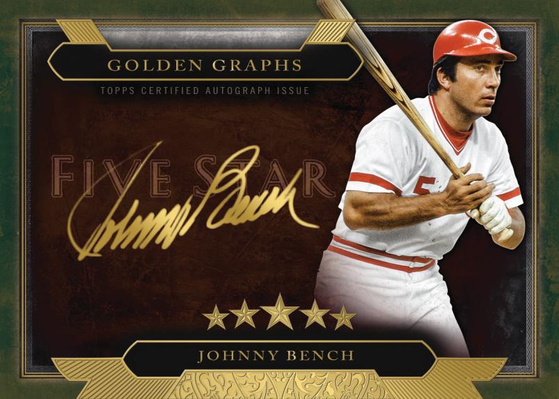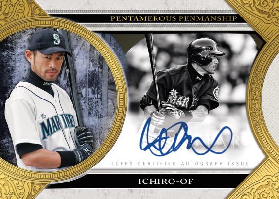 The Basics: Case-level hits will include metallic-ink autos, signed jumbo patches, dual-autos dubbed Pentamerous Penmanship cards and some others. Everything in this one is an on-card auto unless you land a cut-auto card. All jumbo patch autos will be limited to no more than 25 copies and will showcase stars from the past and present. They will have Gold (/10), Silver Rainbow (/5) and 1/1 MLB logo, laundry tag, team patch and jersey brand parallels. Each standard autograph -- "over 50 of the game's greats" here will have a Purple (/50), Blue (/25), Green (/15), Gold (/10), Orange (/5) or 1/1 Red parallel just like last year. Back once again will be dual autos limited to no more than 10 copies, while a new inclusion will be triple-auto cards limited to five max. Silver Signatures and Golden Graphs are back for another go, too, with both found one per case. Golden Graphs will be limited to no more than 40 copies, while Silvers will max at 40. Both will have the following rainbow -- Purple (/25), Blue (/20), Green (/15), Gold (/10), Orange (/5) and 1/1 Red versions. ... Among other inclusions will be Five Tool Phenom autos (/25 max) with 1/1 Five Star parallels and Five Star Signatures (/20 max) as well as Pentamerous Penmanship shadowbox autos (/25 max) with Green (/10), Gold (/5), Orange (/3) and 1/1 Red parallels. There also will be dual-auto versions (/5 max) along with 1/1 cut autos for past MLB legends and even some notable celebs from the past.
