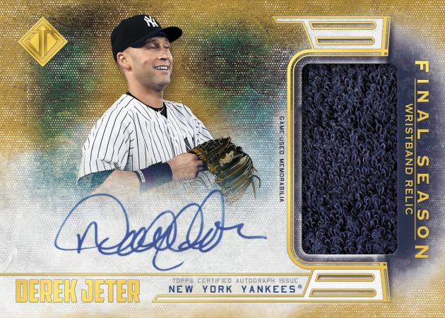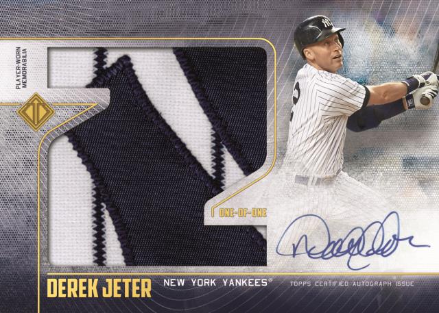 The Basics: There will be one 40-card set per box and all cards will be limited to just 40 serial-numbered copies. Every box will include six The Captain's Career autos (/3 max), one 1/1 framed 3,000 Hits auto, five Final Season Relic autos (/3 max), one 1/1 autographed patch card, one autographed stamped buyback Rookie Card (/40) and one invitation to a future VIP event where Jeter will be the guest. ... Captain's Career autos will be framed and encased with two parallels, Pinstripe (/2) and 1/1 Gold, while the two Relics sets will have those same parallels. The parallels get jumbo pieces for the Final Season Relics and those will have bat, cleat, wristband and fielding glove swatches inside and maybe more. Duals will have batting glove and bat swatches, while triples and quads will have a mix of items.