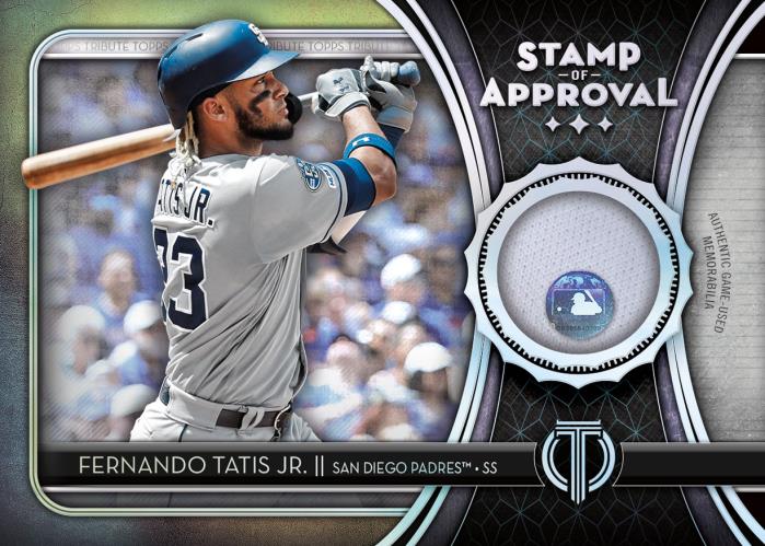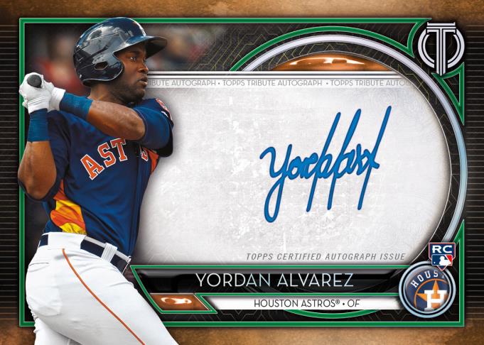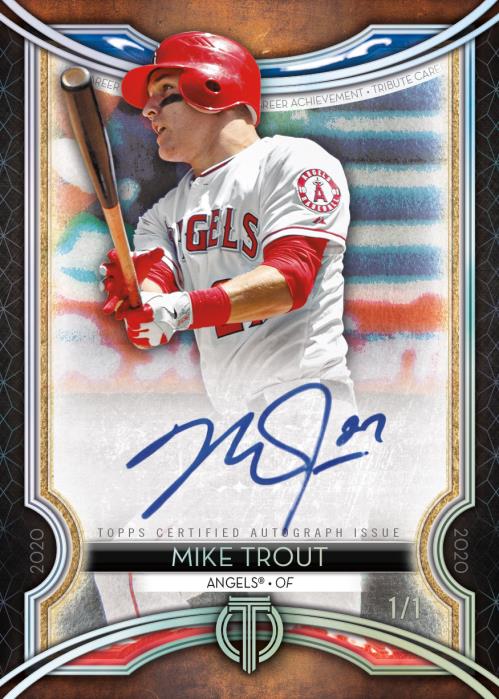 The Basics: Base cards will be found twice per pack in this one with Rookie Cards found just two times per case and a checklist limited to only 10 top players. Both sets will include at least four parallels and possibly more. So far, we know of Green (/99), Purple (/50), Red (/10) and 1/1 Black versions just like this year. ... Franchise Best and Tribute to Great Hitters autographs will both be guaranteed one per case. Each of these will be limited to no more than 99 copies with Purple (/50), Orange (/25), Red (/10) and 1/1 Black parallels -- except there's no Purple for the Best cards. New this time? A Tribute Career Achievement Award auto set with every card of Mike Trout and every card being a 1/1 creation. ... For memorabilia card fans, there will be Milestone Relics (/10) that have a piece of an MLB ball from a milestone moment. These will have Black Jumbo auto versions that will be 1/1 cards. Joining them will be Stamp of Approval Relics (/150) with MLB Authentication-approved pieces as well as dual Relics (/150) and Tribute Relics also limited to that volume. Each of these will have the same Green-Purple-Orange-Red-Black rainbow of parallels with the same volumes. ... For autographs, there will be at least six sets this time around. Leading off will be Tribute Autos (/TBD) with Blue (/150), Green (/99), Purple (/50), Orange (/25), Red (/10) and 1/1 Black as well as printing plates. There also will be Iconic Perspectives autos (/99) with Orange, Red and Blakc versions as well as League Inauguration autos (/99) with the same parallels. Atop those will be Team Tandems book autos (/25) with Red and Black versions as well as an Autograph Patches set (/50) with Reds and Blacks as well as Prime versions with MLB Authentication stickers.