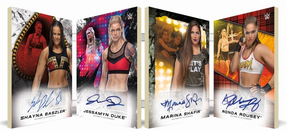 The Basics: Among the inclusions here? A pair of Four Horsewomen autograph books (/25) -- one for the WWE's home-grown stars (Bayley, Becky Lynch, Charlotte Flair and Sasha Banks) and one for the former MMA competitors who have made their way into wrestling led by Ronda Rousey. Could this show something potentially in the works in some way in the ring? We'll see ... but it's odd that these cards hadn't happened until now. ... The base set will consist of highlight cards showcasing the women of Smackdown, Raw and NXT in action in the last year with a parallel lineup that includes Purple (/99), Green (/75), Orange (/50), Blue (/25), Gold (/10), Black (/5) and 1/1 Red versions as well as printing plates. ... Among the inserts will be Roster cards, Breaking Barriers and Superstar Transformations (past and present looks). Each will have Blue, Gold, Black and Red parallels at the same volumes. ... Autographs will have a number of parallels with Pink (/150), Purple (/99), Green (/75), Orange (/50), Blue (/25), Gold (/10), Black (/5) and 1/1 Red versions as well as printing plates. There also will be tag team dual-auto cards with Gold (/10), Black (/5) and 1/1 Red parallels as well as triples with the same parallels. ... Relics will have just one type -- Mat Relics -- and then there will be Championship Plate Patches and Tribute Cut Signatures. ... The two Relics will have Pink (/199), Purple (/99), Orange (/50), Blue (/25), Gold (/10) and 1/1 Red as well as autographed (/10) versions -- and those will have Red (1/1) parallels.