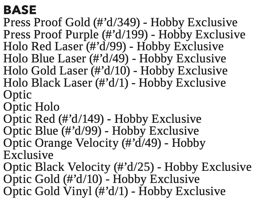 The Basics: Boxes of this one will include 72 Optic cards 12 Optic parallels and 60 inserts atop that along with the base and hits. There will be 30 cards per pack (360 per box). The base set will include 200 cards with 25 of those being Rated Rookies. There will be more than a dozen parallel sets to chase (noted in gallery) and most will be hobby-only finds. ... Among the inserts will be Kaboom!, Net Marvels, Retro Series, Craftsmen, 1991 Donruss Tribute and Zero Gravity with Press Proofs among the parallels (not detailed in advance). ... Among the hits will be Signature Series, The Beautiful Game autos (singles and duals) and Hit Kings jersey cards. They also will have parallels but those were not noted in advance. ... Boxes of this one will carry a suggested retail price of $150.