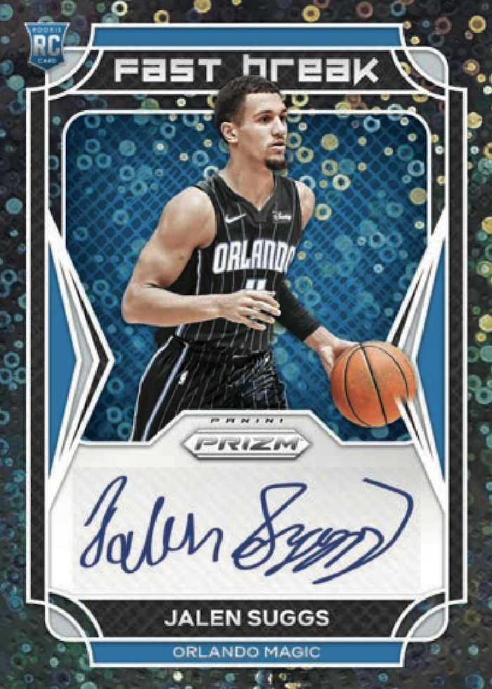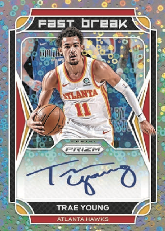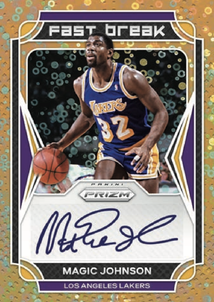 Update (April 22): There will be Fast Break boxes for this one with 10 nine-card packs per box (20 boxes per case) this time. Boxes will carry a suggested retail price of $275.50 this time around with an arrival date of June 10. Each box will include one autograph, 12 Prizms, six insert cards and one rookie variation in this one. Prizm Parallels will include standard Fast Break, along with Blue (/150), Red (/100), Purple (/75), Pink (/50), Bronze (/20) and Neon Green (/5). As seen in the second row of the gallery, everything here will have a Fast Break texture along with their parallel colors. ... Ink will include Fast Break or Fast Break Rookie autos with Gold (/10) and 1/1 Black versions. Inserts will include Prizmatic, Fireworks, Widescreen, Mind Set and Fearless.