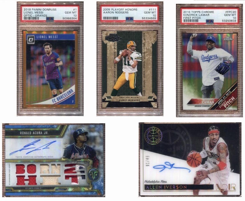The Basics: At least two cards per box here will be graded with luminaries including Leo Messi, Tom Brady, Ronald Acuña Jr., Hank Aaron, Lewis Hamilton, Peyton Manning, Allen Iverson, Aaron Rodgers, Steph Curry, Dak Prescott, Kyler Murray, Erling Haaland, Mike Trout, Bryce Harper and more among the cards teased. There also might be some surprises as a Kendrick Lamar MLB card is also among those teased.