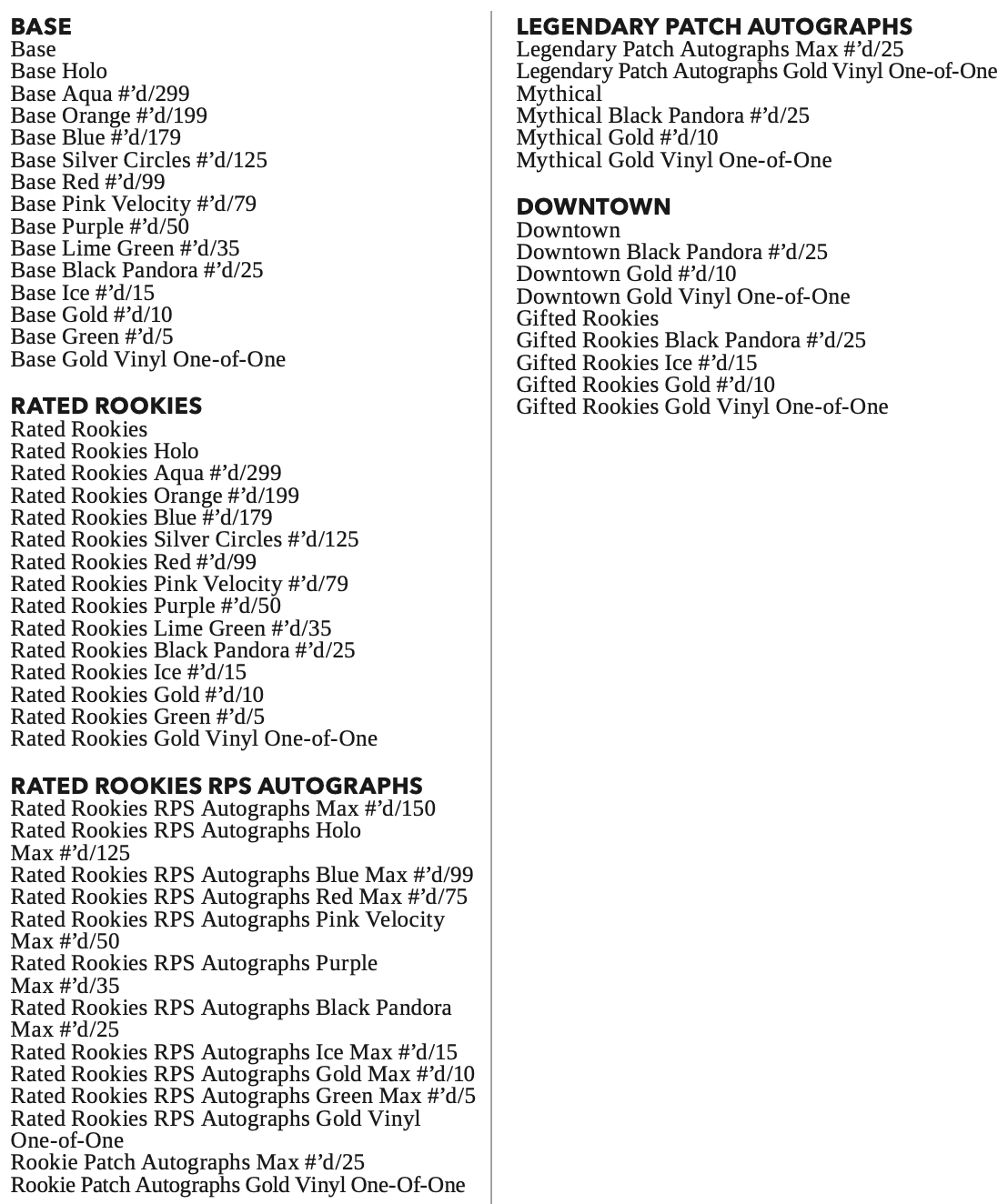 The Basics: Boxes will deliver 20 Rated Rookies, four inserts and 10 parallels (eight of those numbered) from a lineup noted in the gallery below. The basic set will include 200 cards with 100 Rookie Cards. Rated Rookies will have on-card autographs here and they will be joined by Rookie Patch Autos (/25) and Legendary Patch Autos. ... Among the inserts will be Mythical (noted as an SP), Gifted Rookies, Downtown (a case hit), Rising Sons, Globall and Legendary Logos. ... Boxes will carry an increased suggested retail price of $225.