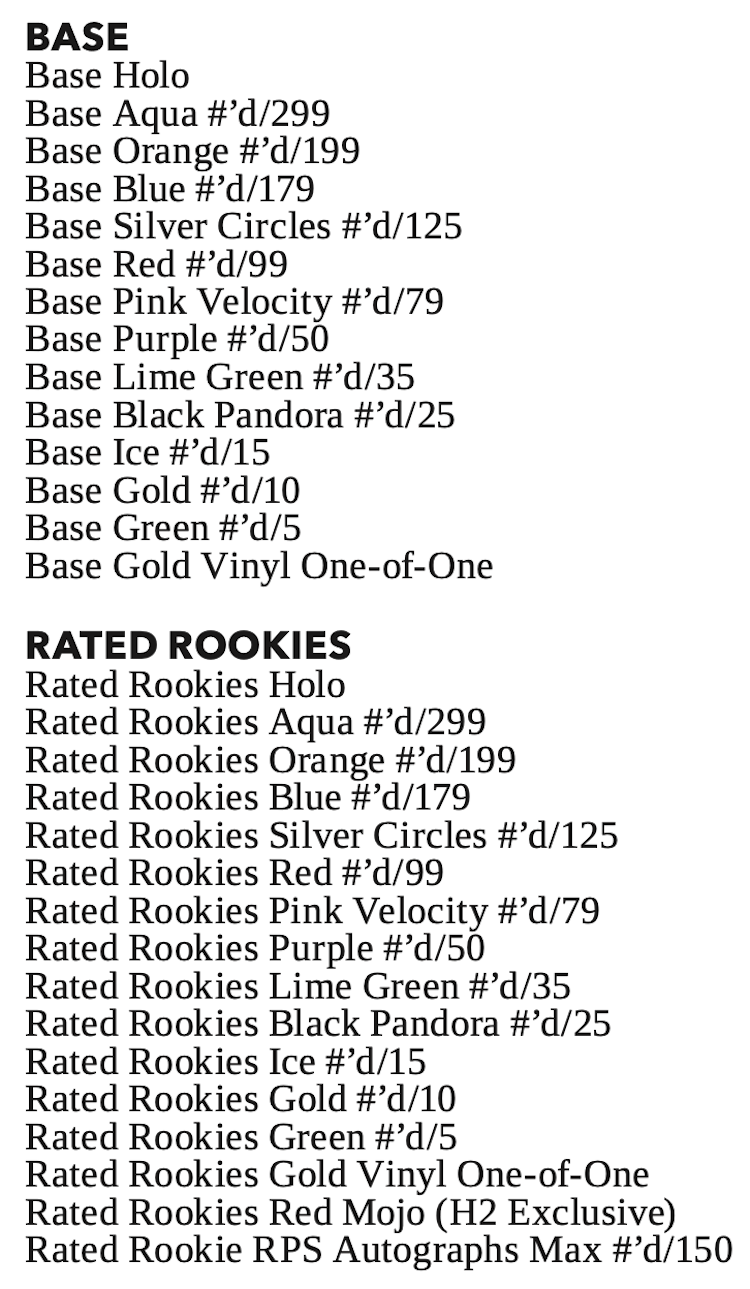 Update: There also will be H2 boxes for this one arriving on May 18 with eight packs per box (20 per case) with a suggested retail price of $115 a box. They'll include four Red Mojo parallels only found here, one other parallel, 12 Rated Rookies, one Holo Rated Rookie, one base Holo parallel and five other inserts. No ink will be guaranteed per box but Rated Rookie ink will be possible here. (See gallery for parallel breakdowns.)