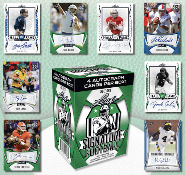 The Basics: There will be three Leaf Football autos per box here -- a mix that will include Green and Blue versions -- and them one Leaf Hall of Fame Football autograph every time, too, with those also having Blue and Green versions. ... No other info was released but some of the teased players include Trevor Lawrence, Trey Lance, Zach Wilson, Joe Montana, Y.A. Tittle, Nico Collins, Justin Fields and Jim Covert.