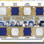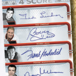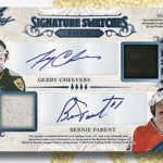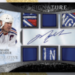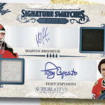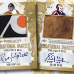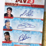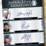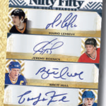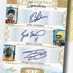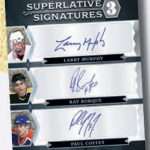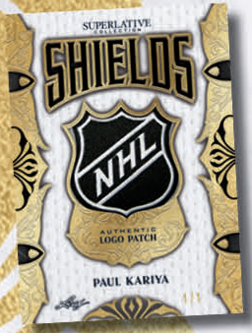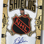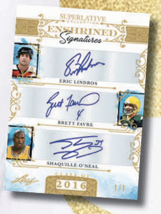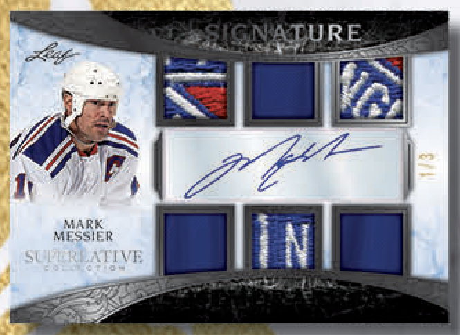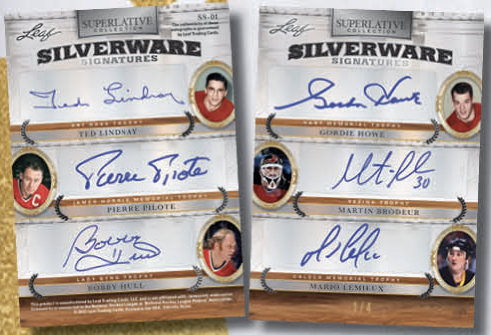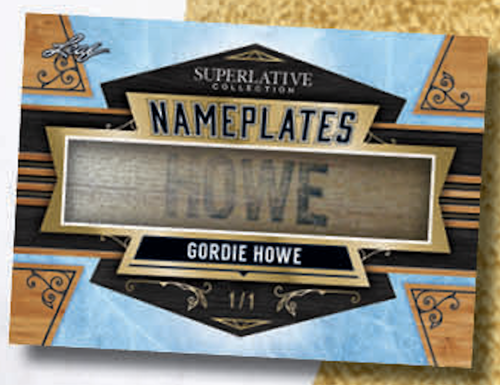 The Basics: There are roughly 25 different sets of cards in this one, including Superlative Signature Memorabilia, Trouvaille, Nameplates, Superlative Shields, Superlative Shields Signatures, Stadium Relic Signatures, Spectacular Patch, Personal Equipment, Signature Swatches Four, Superlative Enshrined Signatures, The Superlative 16, Trouvaille Four, Superlative Signatures (two, three, four, six and eight), Superlative Silverware Signatures, The Nifty 50, MV3, Sensational Swatch Signatures Two, The 100 Greatest of All-time, Stacking the Pads, Four Score, Superlative Streaks, Superlative Seasons, The Superlative Six and Superlative Mystery Cuts redemptions for rare cut autographed cards. The lineup is loaded with prime memorabilia pieces and ink from many legends as you can see in the gallery below. Among them? Gordie Howe, Martin Brodeur, Mario Lemieux, Ted Lindsay, Bobby Hull, Joe Sakic, Eric Lindros, Ron Hextall, Grant Fuhr, Mark Messier, Ray Bourque, Brett Hull and even some stars from beyond the ice like Brett Favre and Shaquille O'Neal.