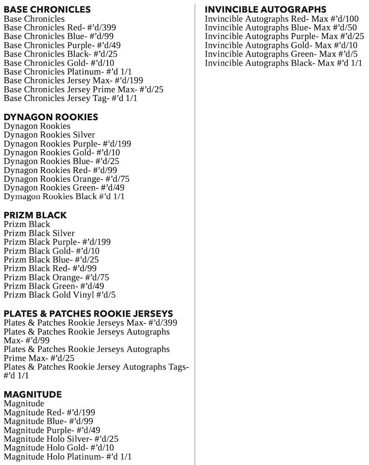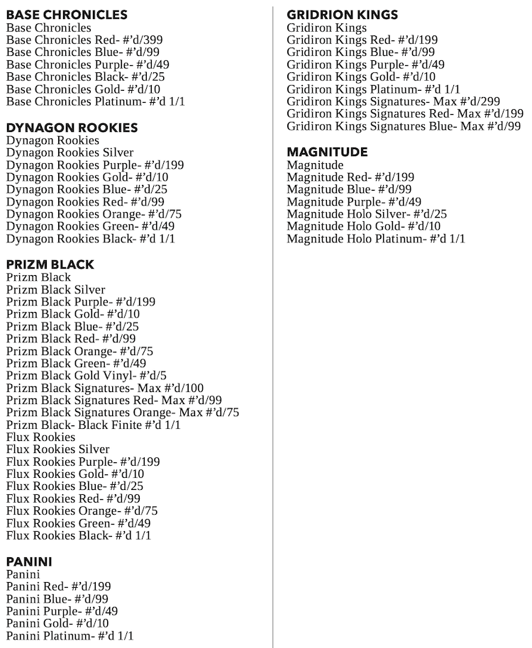 The Basics: Beyond the hits here, there will be four serial-numbered parallel cards, 26 inserts and two silver parallels. ... Rookies get NFL jersey updates on Optichrome-stock versions in Score and Legacy Update, while other finds will include Dynagon Rookies, Prizm Black, Panini, Gridiron Kings, Crown Royale, Timeless Treasures, Playoff Momentum and Clear Vision for starters. New inclusions will be Flux Rookies, Plates & Patches, Invincible and Magnitude cards. ... The Chronicles base set will include stars from the past and present with some parallels exclusive to particular pack formats (see parallels for everything that was announced in the gallery below). ... Boxes once again will carry a suggested retail price of $175.