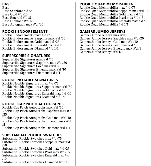 The Basics: The base set will include 100 cards with "all of the biggest names that the NFL has to offer" with a relatively small rainbow of parallels (see gallery) and just one of the cards (base or parallel) per box. Some will have autographed versions. ... Among the hits here are Rookie Endorsements, Superscribe Signatures, Rookie Notable Signatures, Sapphire Signatures (blue ink) and Rookie Cap Patch Autographs for starters. Joining them will be Substantial Rookie Swatches, Rookie Quad memorabilia cards and Gamers jumbo jerseys. Among the graded auto sets will be Reserve Signatures, Superscribe Signatures, Legendary Signatures, Rookie Endorsements, Rookie Dual Swatch Signatures, Scripted Signatures and HOF Material Signatures.