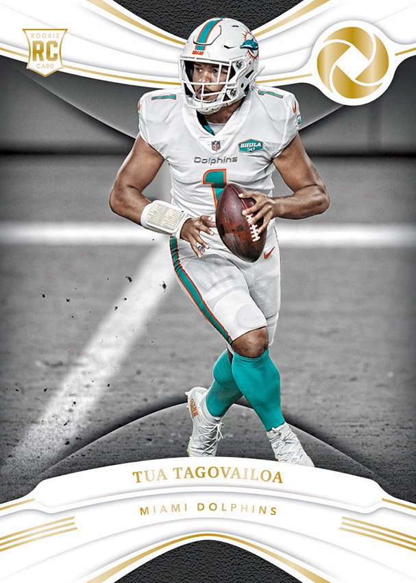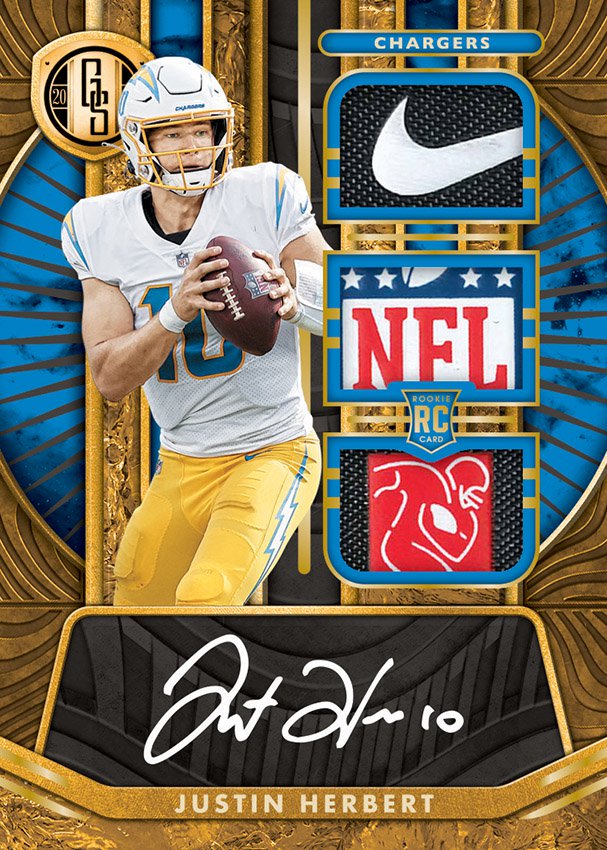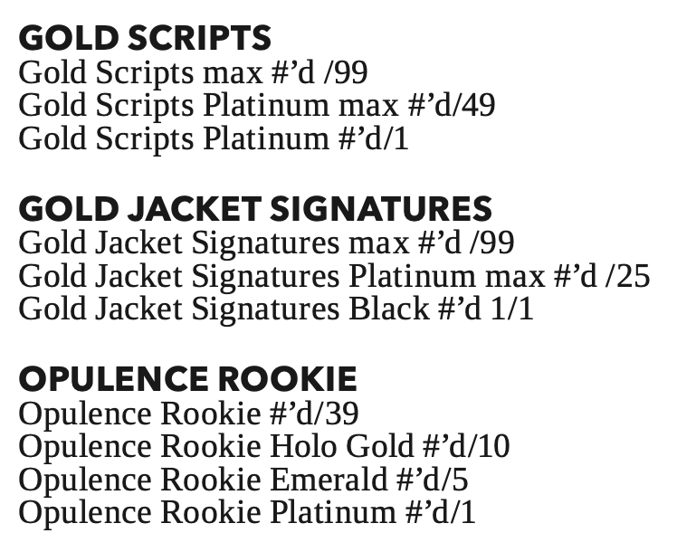 The Basics: The base set (/99) for this one will include 100 cards, though you'll get no more than two per box and they'll sometimes be replaced by parallels -- see the breakdown below. There also will be 100 cards in the rookies portion of the set with autographed parallels there. ... Rookie jersey autos once again will have single-, double- and triple- swatch versions with parallels. Joining them among the hits are Gold Scripts, Gold Jacket Signatures, Super Bowl Diamond Signatures, Dual Super Bowl Diamond Signatures and Golden Shield Signatures as well as new Hallmarks and Au autographs. Memorabilia card sets will include Hall of Gold, Gold Gear, Gold Rush, White Gold, Mother Lode and Golden Pairs. Those will have prime parallels (/49 max) down to 1/1 copies. ... Among "new super-rare inserts" are Opulence Rookies, Double Eagle and Liquidity cards. ... Boxes carry an increases suggested retail price of $200. ... Note: The rookies seen here are mocks to show how new NFL rookies will be seen in their pro uniforms.