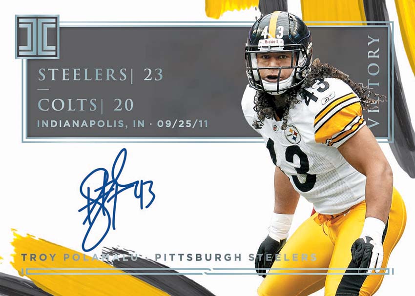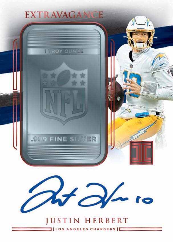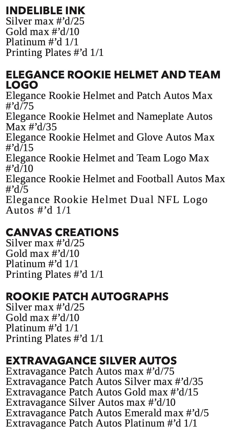 The Basics: Firestarter autos, Silver USA Flags and Extravagance silver autos are among new inclusions in this one. ... Beyond the ink, each box will include three base cards or parallels and on the case level, there will be one silver or gold metal card with the possible finds including silver Hall of Famers, Super Bowls, NFL Shield and USA Flags as well as gold NFL Shields. Upping the ante will be Extravagance Silver autos with ink to go with the heavy metal. ... Among the hits will be Indelible Ink, Elegance rookie helmet and team logo autos, Canvas Creations, Rookie Patch Autos, Impeccable logo autos, Masterstrokes (/25 max) and Inkpeccable duals, trios and quads. You can see parallel breakdowns below. ... These carry an increased suggested retail price of $700.