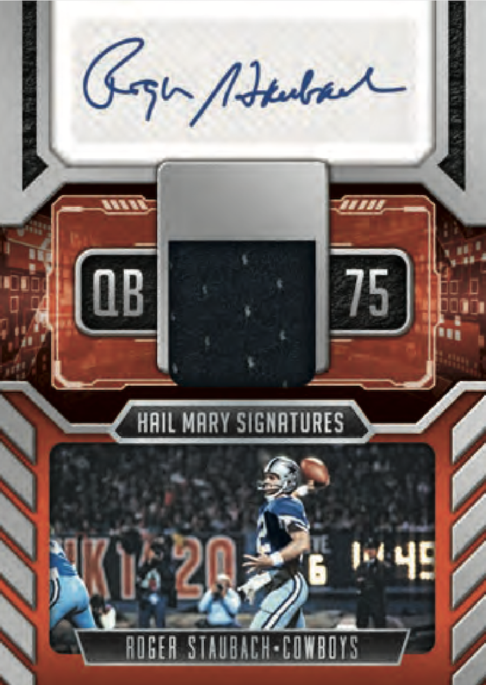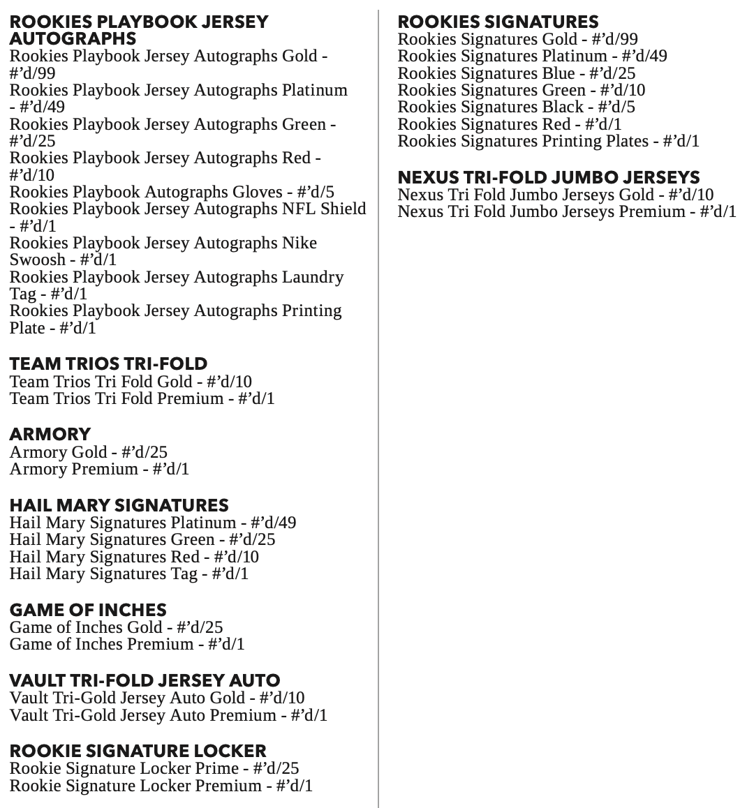 The Basics: Among the booklet cards in this one will be rookie jersey autos, (/299 max), Team Trios Tri-fold autos (/25 max), Armory, Game of Inches (/49 max), Vault jersey autos (/25), Rookie Signature Locker autos, Red Zone and Nexus jumbo jerseys. Joining them on the hits front will be Hail Mary Signatures, Goal Line Graphs, Signature Routes, Rookie Signatures (/99 max). Parallel breakdowns can be seen in the gallery below. ... Boxes carry an increased suggested retail price of $200.
