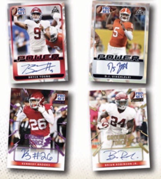 The Basics: A number of notables from today's college game as well as the recent past -- and also some top prep standouts -- are in play here with some past Pro Set Power designs to be found. Subsets such as Ground Force and Campus Kings are in the mix, too, with parallels. (No details in advance.) Among the names teased here are C.J. Stroud, Bryce Young, John Metchie, Najee Harris, Isaiah Spiller, Grayson McCall, Kayvon Thibodeaux, Graham Mertz, Matt Corral, Kennedy Brooks, Brian Robinson Jr. and Trevor Lawrence among others.