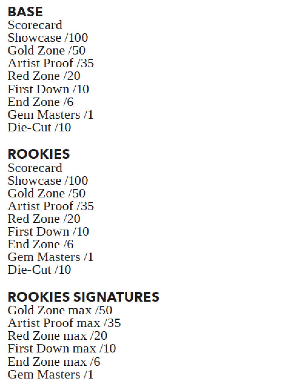 The Basics: There will be 40-card packs once again for this one with 10 parallels and 36 inserts in a typical box along with one Tom Brady TD Tribute card documenting all of his scores from his career. ... The base set will have 300 cards with each having nine parallels in hobby boxes (see gallery for breakdown) and the same will apply for Rookie Cards in this one (last year's players used in mocks below). Rookie autos will also be in play here with parallels coming as low-volume creations -- nothing over 50 copies. Veterans also will have autographs in this one, though any parallels were not detailed there. Among the inserts will be Hot Rookies (again, mocks use last year's players), All-Hands Team, Breakthrough, NFL Draft, Fantasy Stars, Celebrations, Base Dynamics and Intergalactic cards (using lenticular technology a la Sportflics). Those last two cards will be rarer finds. ... New this year will be die-cut base card parallels limited to only 10 copies and these will only be found in hobby boxes. ... Boxes will carry an increased suggested retail price of $120.