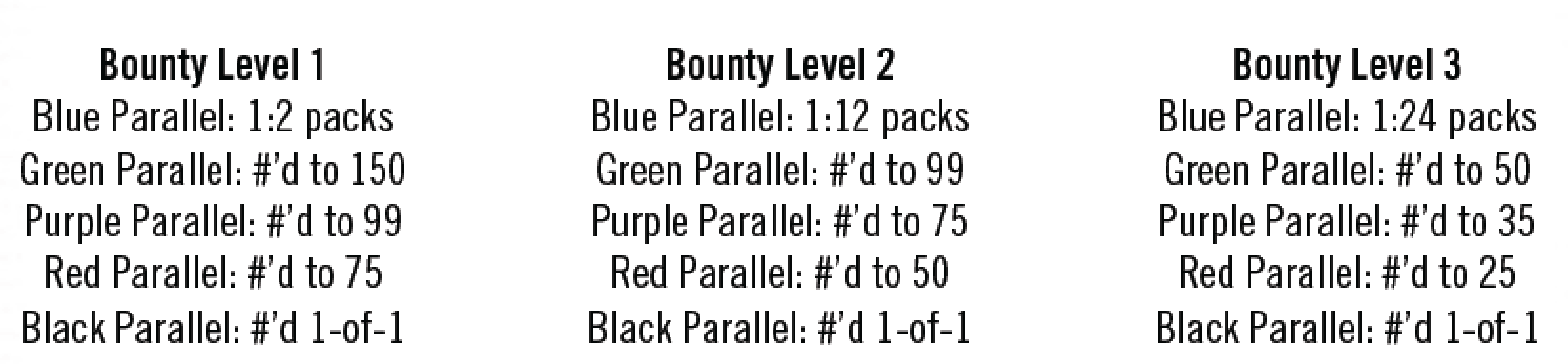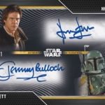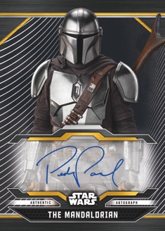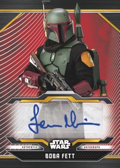 The Basics: The base set here will have three "Bounty Level" tiers each with five parallels per card per tier -- see gallery -- and four of those parallels are serial-numbered. ... Insert cards will include Feared Mercenaries (50 cards) focusing on The Mandalorian, Jango Fett (six per box), Boba Fett (six per box), Aurra Sing (four per box) and Cad Bane (two per box). Also in the mix will be a five-card Feared Mercenaries Die-cuts set (two per box) showcasing the bounty hunters in Empire. ... Among the hits will be autographs, sketch cards and commemorative patches. The patches will have hobby-only parallels --- Green (/99), Purple (/50), Gold (/25), Red (/5) and 1/1 Black versions. ... Autographs will include TV and film stars with Blue (/99), Green (/75), Purple (/50) Gold (/25), Red (/10) and 1/1 Black as well as printing plates. ... Also in play here will be dual-auto cards (/25 max) with Red (/10) and 1/1 Black parallels as well as triple-auto cards (/5 max) with just Black parallels. ... Sketch cards will be found in standard and triptych forms. ... A selection of stamped buybacks from the 1977 Star Wars set also will be in play here with a bounty in play. "Collectors who acquire 25 of these cards are eligible to receive a special exclusive 1/1 Star Wars Bounty Hunters ULTMATE BOUNTY Autograph," according to Topps.