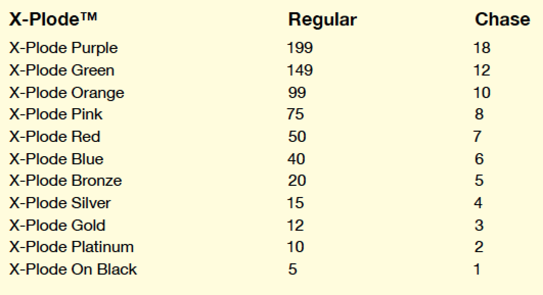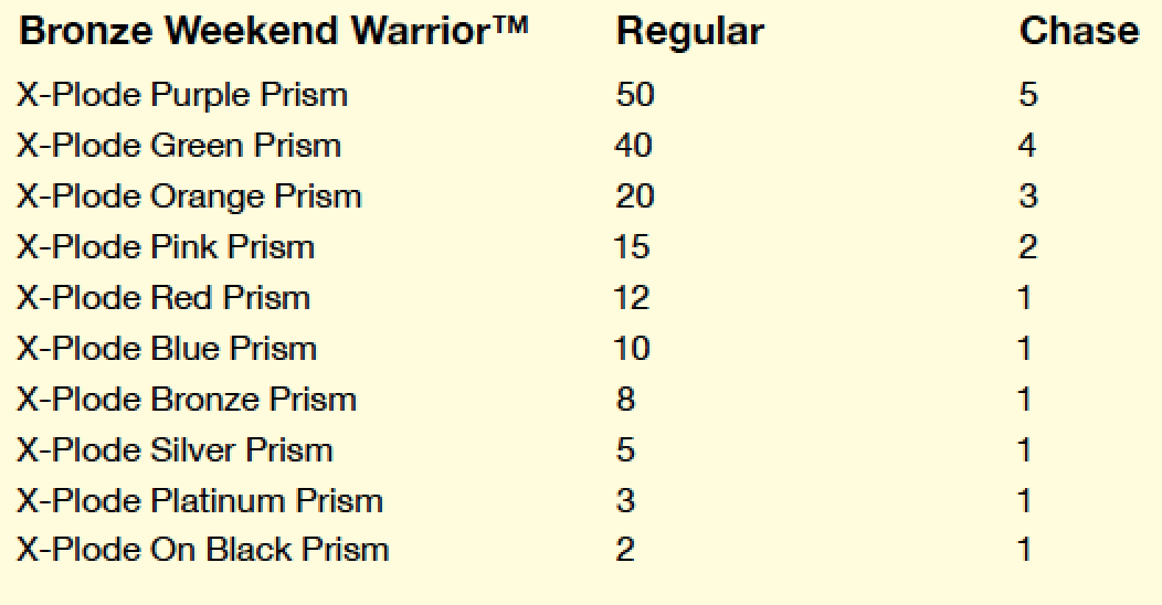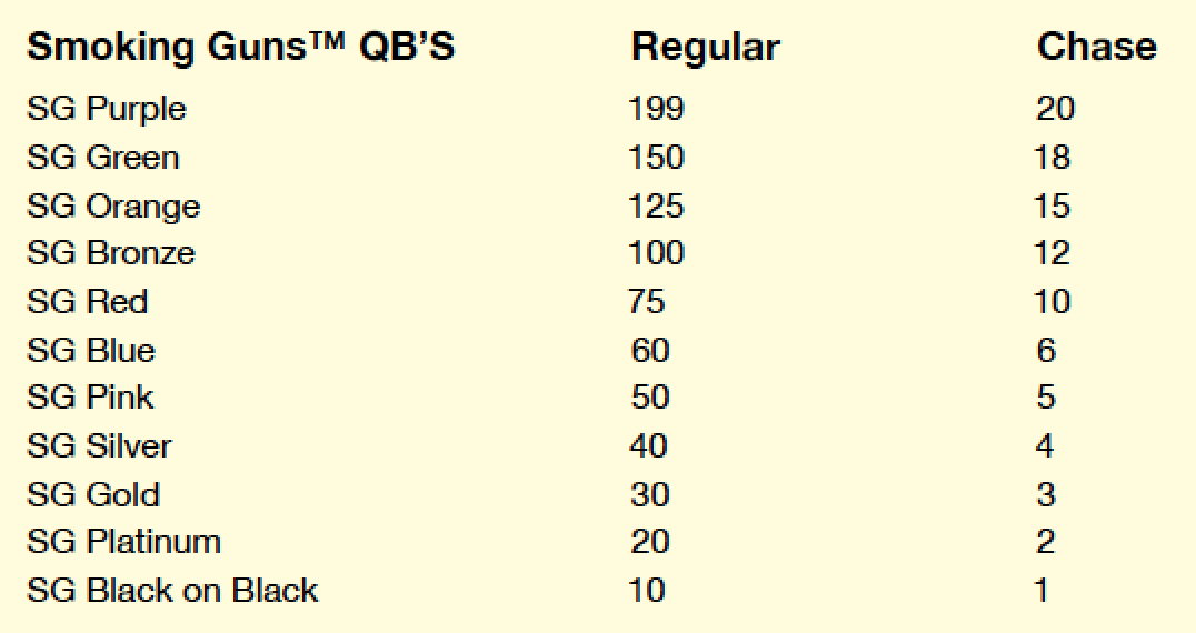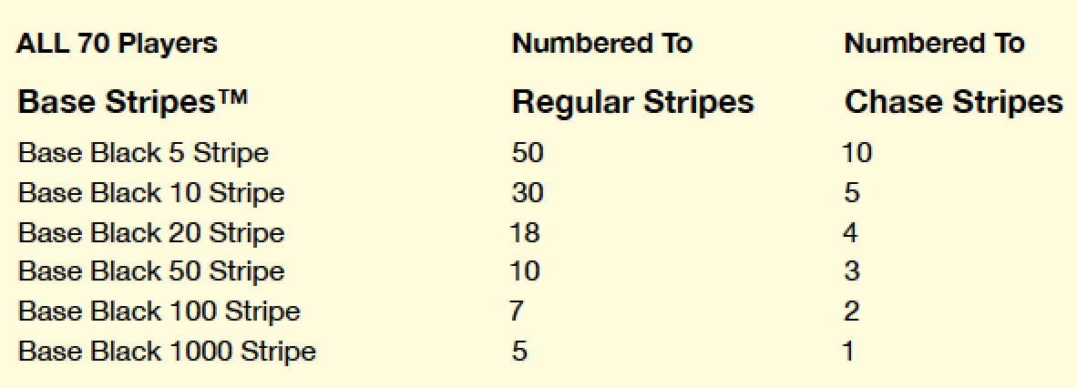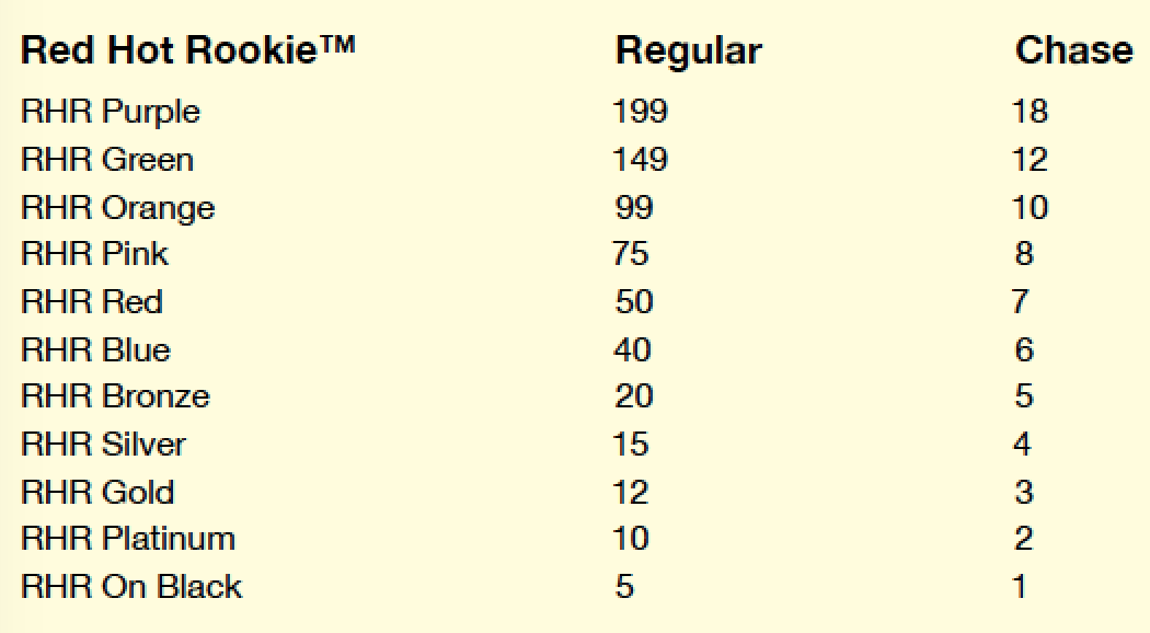 The Basics: There once again will be Black and White boxes with each having either Red or Blue Chase Packs with rarer cards inside. ... The base card inclusions were not detailed here but should follow the previous release. ... Among the cards only found here will be Bronze Weekend Warriors cards, Pink X-Plode cards, Red Holo Red Hot Rookies, Smoking Guns and Stripes cards. ... Stripe cards will be found for 70 players on base cards with six different stripes (see gallery for details) and their six Chase versions being even more limited. Red Hot Rookie cards will be found for 25 players in 11 colors also with their own rarer Chase versions in 11 colors. Smoking Guns will be found for 10 players with new colors here and each will have 11 versions from 199 copies down to 10 copies per card with 11 more Chase versions limited to 20 or less. Weekend Warriors will be found for 35 players and will have 10 Prism parallels all rarer than 50 copies while Chase cards are limited to no more than five. The X-Plode cards will have 25 players on the checklist with 11 versions per card and 11 more Chase versions.