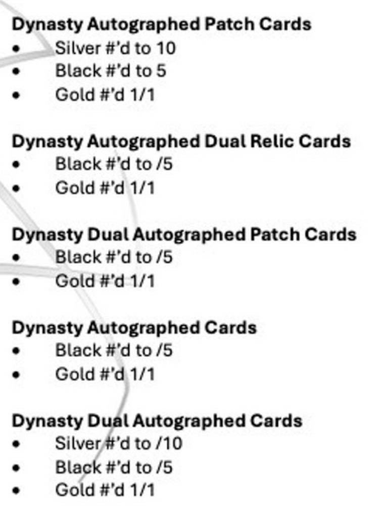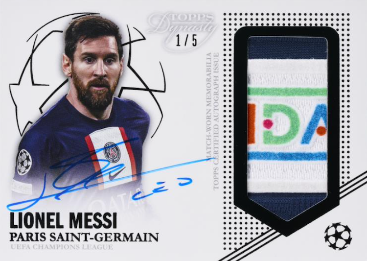 The Basics: Dynasty Autographed Patches will be limited to 10 copies per card with all items game-used and all autographs signed directly on-card for this one. There will be 1/1 inscriptions, dual-auto cards and Starball patch autos. Also in the mix, according to Topps UK, will be mystery redemptions in some boxes and that will be found along with another card. They "are paired on average with select autograph Relic cards from the following subjects: Karim Adeyemi, Kyogo Furuhashi, Mason Mount, John Terry, Virgil van Dijk, Ansu Fati, Kai Havertz, Darwin Núñez, Andy Robertson, Jack Grealish, Henrik Larsson, Youssoufa Moukoko, Gianluigi Buffon and Gianfranzo Zola." ... The full checklist is linked above and it includes Lionel Messi, Jude Bellingham, Robert Lewnadowski, Neymar Jr., Erling Haaland, Harry Kane, Ronaldo, Wayne Rooney and Jose Mourinho for starters.
