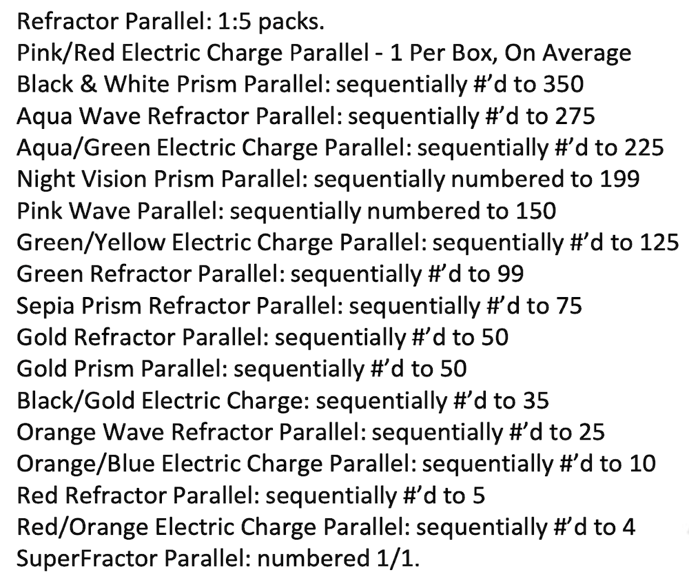 The Basics: All 100 cards in the base set will have at least 18 parallels in this one (see gallery) while Members Only rookie photo variations will only have five versions to chase -- Gold (/50), Orange (/25), Black (/10), Red (/5) and 11 Superfractors. ... There will be five insert sets this time -- Goal Force, Glimpses of Gold, Championship Contributions, Legends of Europe and Beam Team -- with the first four having Prism, Pink Wave, Green, Gold, Orange, Black, Red and Supers for parallels at same volumes as the parallels noted in gallery. Beam Team will only have the four-rarest parallels. ... Autographs will have five sets in this one -- Chrome, Behind The Lens, Beam Team, Co-Signers and Members Only rookie variations. Standard ink will be found with Green (/99), Blue Wave (/75), Gold Prism (/50), Orange Prism (/25), Black (/10), Red Wave (/5) and 1/1 Supers. Rookie variations will only have Supers, while the Lens cards will have Gold Prism, Photo Negative (/25), Black & White (/10), Dark Room (/5) and 1/1 supers. Beam Team autos once again will have Gold (/50), Orange (/25), Black (/10), Red (/5) and 1/1 Supers and that same lineup will apply for Co-Signers but without Gold.