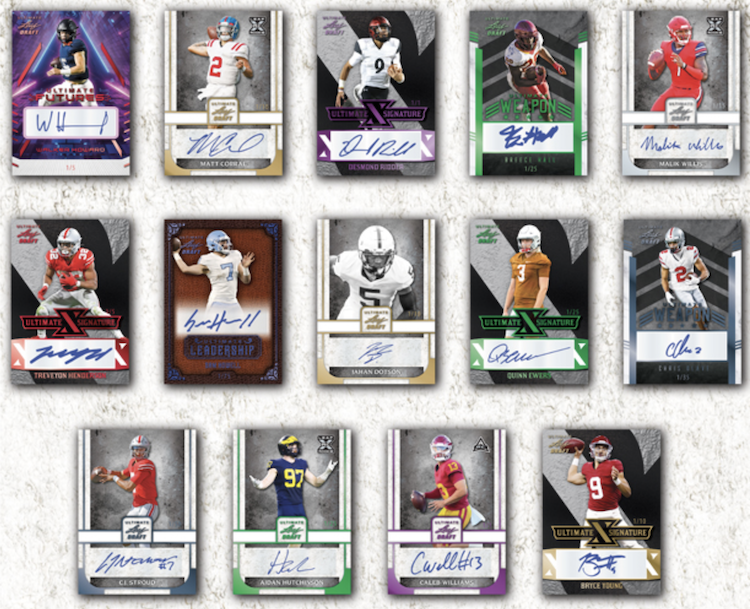 The Basics: There will be nothing but autographs to be found in this one from a number of sets each with parallels (rainbows not detailed). There will be Ultimate X, Ultimate Weapon, Ultimate Futures and Ultimate Leadership autos to be found and some of the names teased above include Aidan Hutchinson, C.J. Stroud, Bryce Young, Caleb Williams, Quinn Ewers Matt Corral and Malik Willis for starters. ... No other details were released.