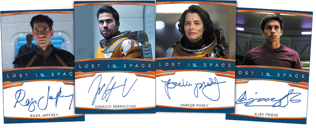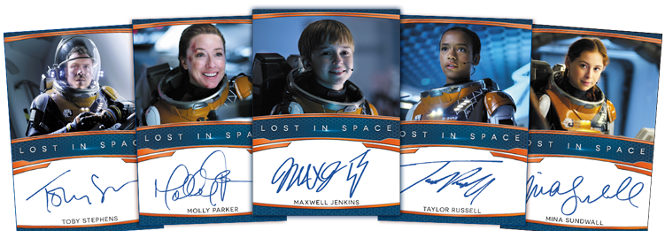 The Basics: There are 18 Season 2 and Season 3 base cards in this release with six of those cards found per pack. Joining them are three Character cards and those come from an eight-card set. The rest of the cards in the pack are autographs from a small 12-card lineup that includes Maxwell Jenkins (Will Robinson), Toby Stephens (John Robinson), Molly Parker (Maureen Robinson), Taylor Russell (Judy Robinson), Mina Sundwall (Penny Robinson), Parker Posey (Smith), Ignacio Serricchio (Don West), Raza Jaffrey (Victor Dhar) and Ajay Friese (Vijay Dhar). Teased duals include Jenkins/Parker, Jenkins/Sundwall and Jenkins/Russell. ... Packs carry a suggested retail price of $299.99.