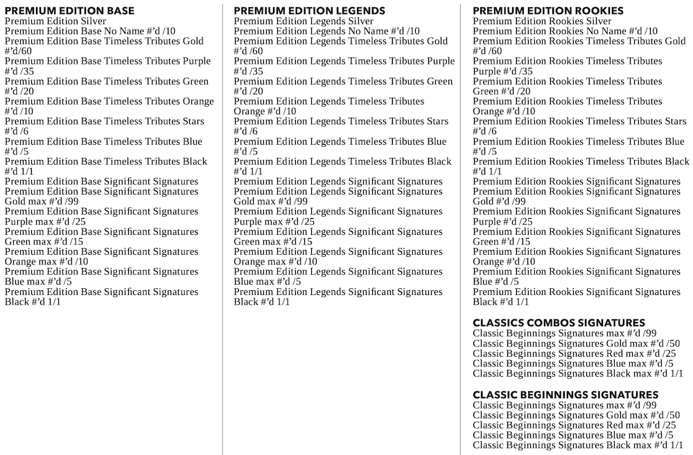 The Basics: Boxes will include three numbered parallels, one Silver card and the two autos each time. ... The base set will include 100 veteran cards, 50 legends and then 50 top rookies in this one with an array of parallels for all (see gallery) with standard cards as well as autographed versions. ... Among the other autos will be Classic Beginnings (rookies), History Makers and Classic Combos dual-auto cards. (Note: Rookies are mocks here using previous year's stars.) A case-level find will be Team Colors Throwback Edition cards showing players in past and present uniforms.