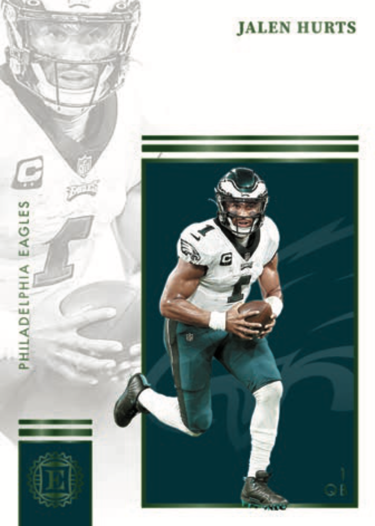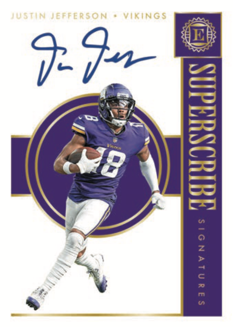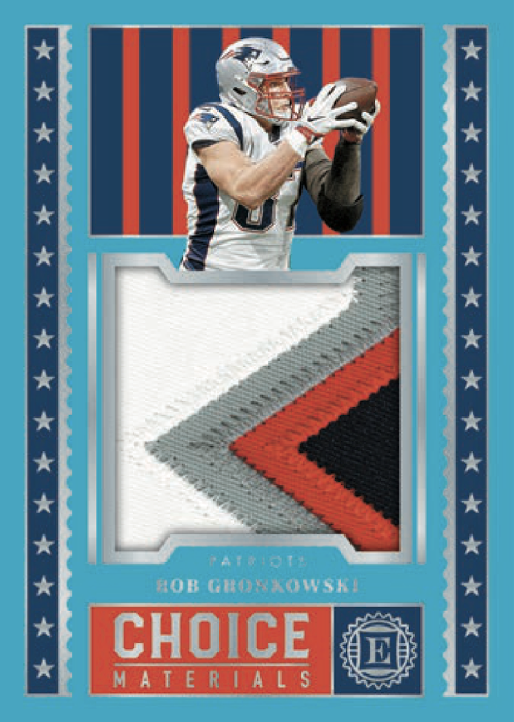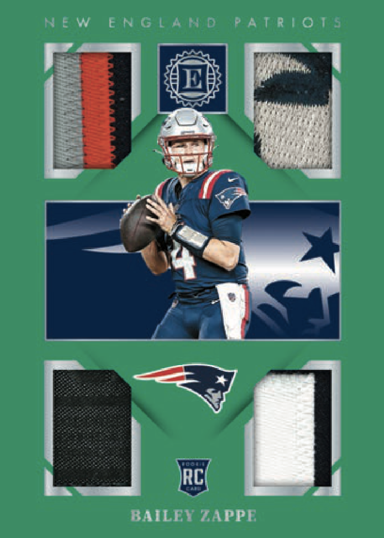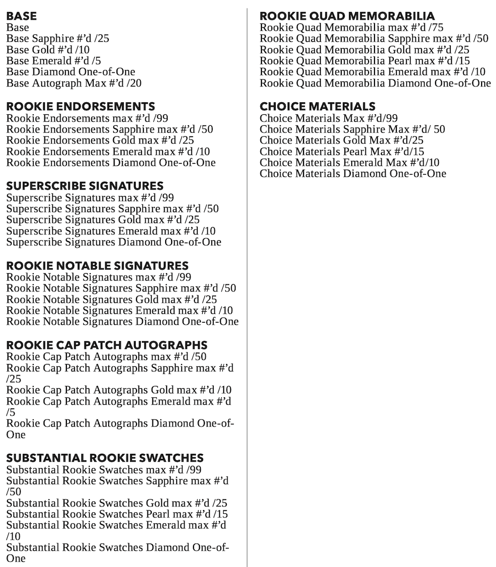 The Basics: The base set will include 100 cards that once again includes "all of the biggest names that the NFL has to offer" with a relatively small rainbow of parallels (see gallery) and just one of the cards (base or parallel) per box. Some will have autographed versions. ... Among the hits here are Rookie Endorsements, Superscribe Signatures, Rookie Notable Signatures, Sapphire Signatures (blue ink) and Rookie Cap Patch Autographs, Milestone Marks and Century Signatures for starters. Joining them will be Substantial Rookie Swatches, Gamers jumbos, Rookie Quad memorabilia cards and, Encore Collection and Choice Materials jumbo jerseys. ... On-card ink will be found in the Superscribe, Legendary, Rookie Endorsements, Rookie Dual Swatch, Scripted Signatures, Vaulted Veteran Material Signatures autograph sets. ... Boxes will carry a suggested retail price of $250.