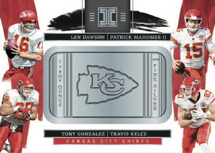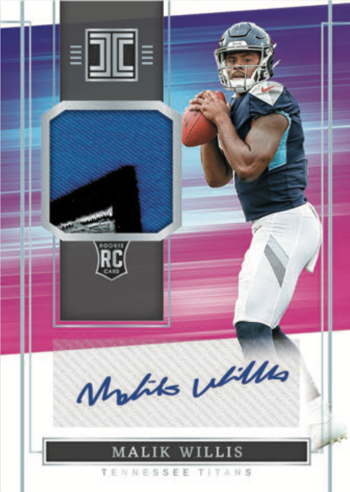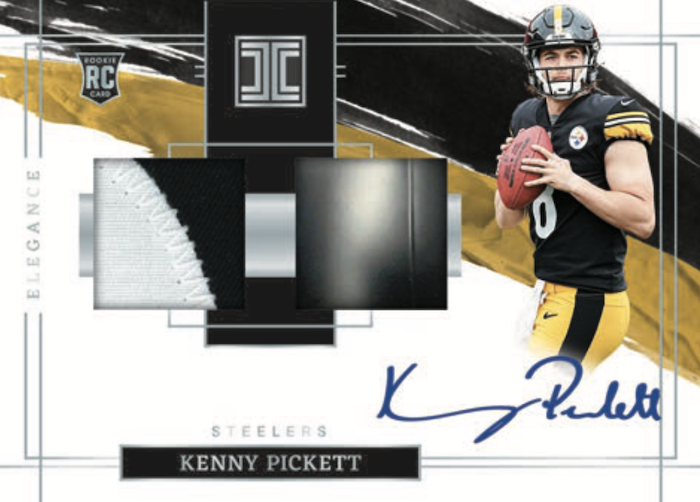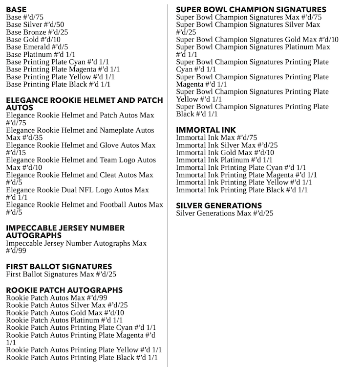 The Basics: Auto and then base cards or parallels (details in gallery) from the 100-card base set are all that will be found here -- some boxes with more ink than others. ... New among the autos this time are Impeccable Hall of Fame, Immortal Ink, Impeccable Stars and Illustrious Ink cards, while rookie ink will include patches, Landscape, Elegance helmets and also cleat autos. Also among the hits will be helmet/patch autos, Impeccable jersey numbers, logo autos and nickname autos. Also in play? First Ballot Signatures and Masterstrokes. ... Metal inlay cards (silver or gold) are found one per case, while some multi-auto cards (/25 max) are also in play with Inkpeccable duals, trios and quads. ... Boxes once again carry a suggested retail price of $700.