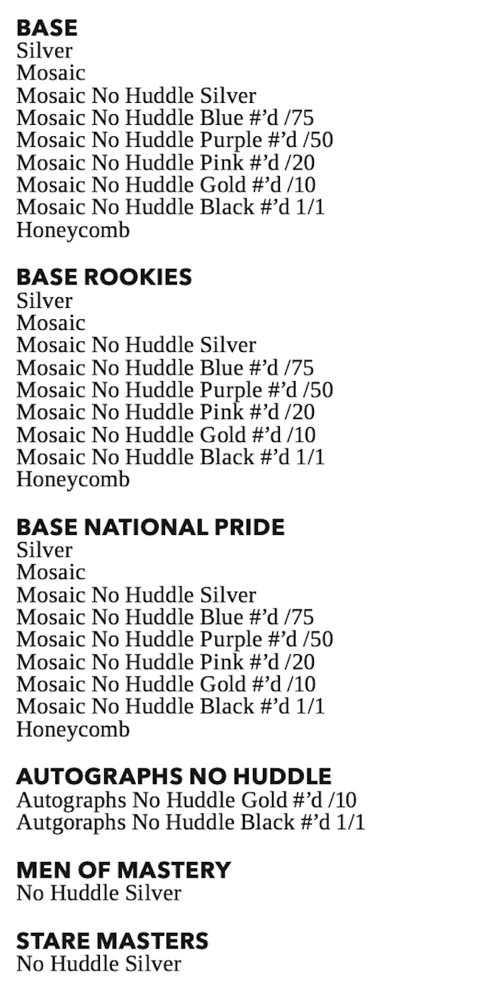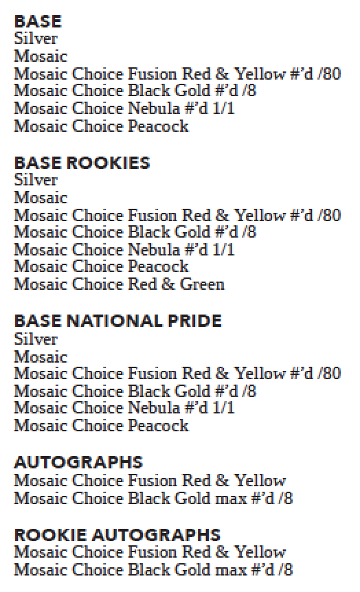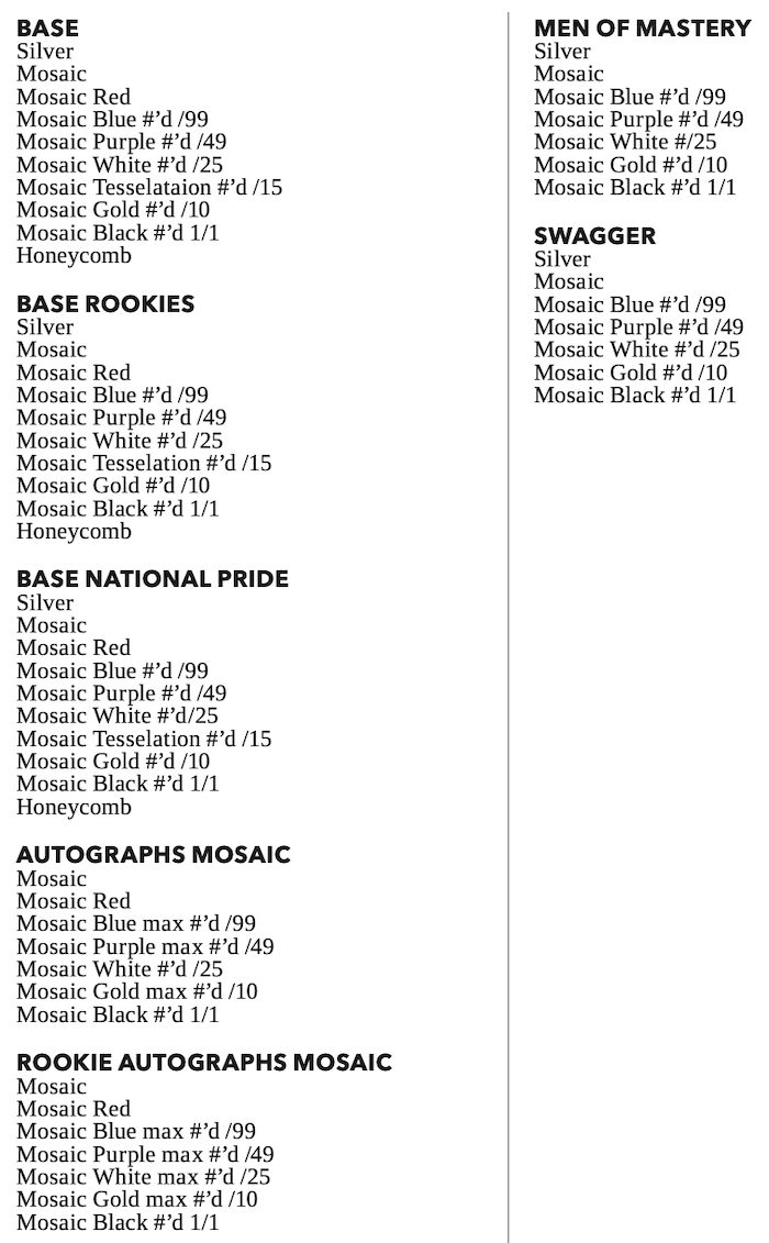The Basics: Each box once again will include five Silver parallels, 15 more Mosaic parallels and 20 inserts along with the hits and base. ... The base set will consist of 300 cards (parallels noted in gallery) with rookies in the mix. ... Among the ink will be Mosaic Autographs and Mosaic Rookie Autographs. ... Among the finds will be National Pride parallels as well as inserts called Men of Mastery, Swagger, Storm Chasers, Center Stage, In It to Win It, Straight Fire and Overdrive. ... There also will be rarer Razzle Dazzle, Busted, Storm Chasers and Glass Mosaic inserts to chase. ... Boxes once again will carry a suggested retail price of $225. ... Note: Rookie Card mocks here use last year's standouts -- this year's rookies will be found in this release.