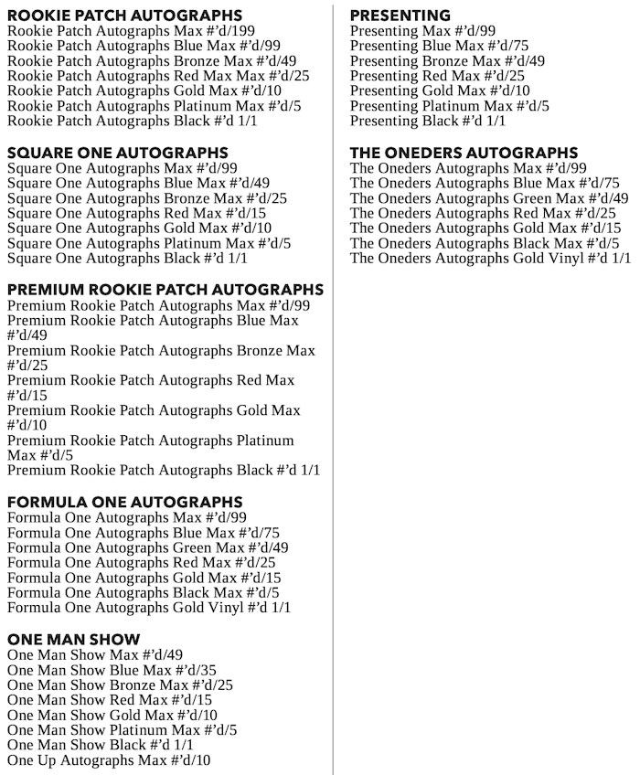 The Basics: Among the hits will be rookie patch autos, Square One autos (four patches per), premium rookie patch autos on acetate, Formula One autos, One Man Show and One Up. ... New this time will be One Small Step, The Oneders, Presenting and "SSP" Surge cards on metal. ... Also in play here will be Once Upon a Time and Precision rookie patch autos. ... You can see the parallel breakdowns in the gallery below. ... These will carry an increased suggested retail price of $150.