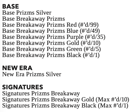 Update (Sept. 30): There also will be 10-pack Breakaway boxes (20 per case) for this one with each guaranteeing two numbered parallels, one Silver Prizm, two Breakaway Prizms, one Silver insert and 14 other inserts. Parallels (see gallery) will also be in play here along with autographs, but not in every box. Other inserts seen in the gallery also will appear in these boxes but without any kind of exclusive Breakaway stock style.