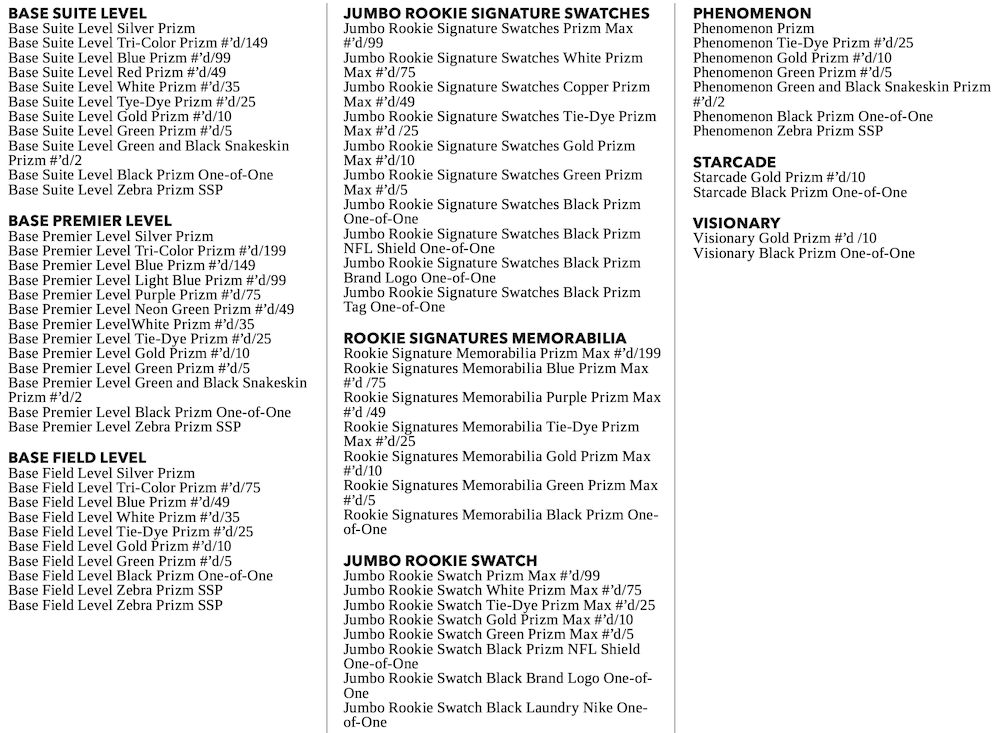 The Basics: Boxes will include 10 Silver Prizms, five other Prizms and six insert cards each time just like last year. There will be one Zebra parallel card per case, too. ... The base set will include 400 cards with a number of parallels for each of its tiers -- Concourse, Premier Level, Club Level, new Suite Level and Field Level. See the gallery for a full breakdown there. ... Among the hits will be jumbo rookie signature swatches, rookie signature memorabilia and jumbo rookie swatch cards for starters. ... For inserts there will be Phenomenon, Snapshots, Sensations and Neon Icons as well as a trio of SSP finds -- Starcade, Visionary and Multiverse -- for starters. ... There will also once again be XRC cards for players taken in this year's NFL Draft. ... Boxes once again carry a suggested retail price of $250.