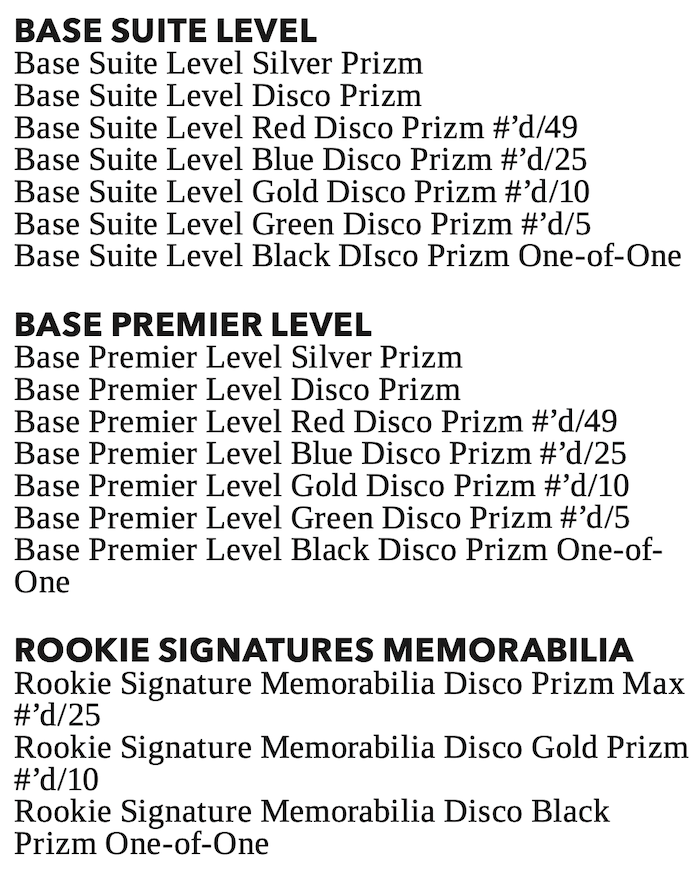 Update: There also will be H2 boxes for this release with four six-card packs per box (20 boxes per case) with two autos per case. Each box will include two Silver, four Disco, 10 Concourse, six Premier and two Club cards. Parallel details are in the gallery.