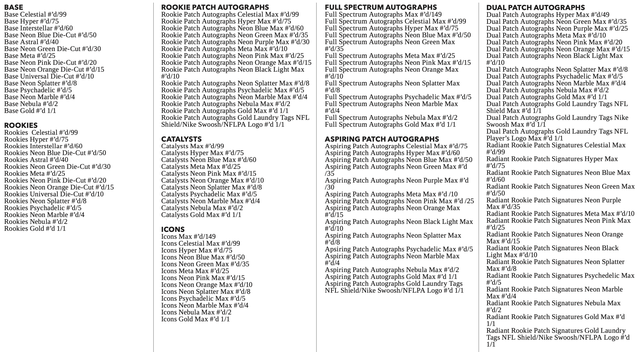 The Basics: There will be seven base cards or parallels and one insert per box atop the hits. The base set once again will include 135 cards with an array of parallels (see gallery details) which include the new Interstellar, Astral and Universal Die-Cut cards. ... Among the autos will be Champions, Illustrious Legends, Sky High Signatures, Full Spectrum, rookie patches, Icons, Aspiring patches, dual-patch autos and Radiant Rookie patches. ... Among the memorabilia cards will be Catalysts. ... Among the inserts will be Rookie Spectris, Wavelength, and Spectraverse. ... Packs once again carry a suggested retail price of $112.50 apiece ($450 per box).