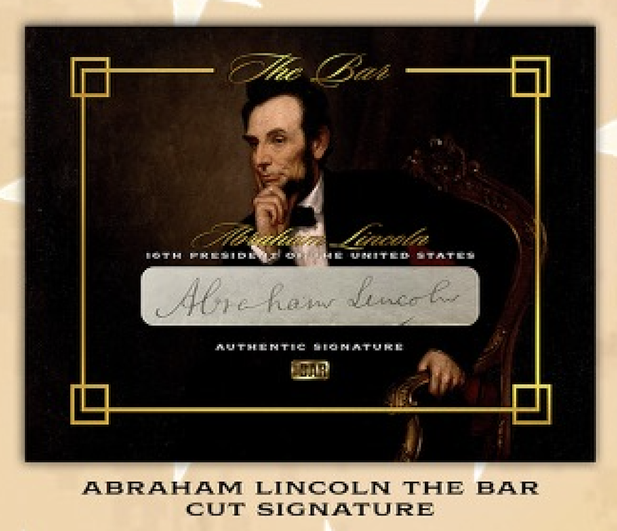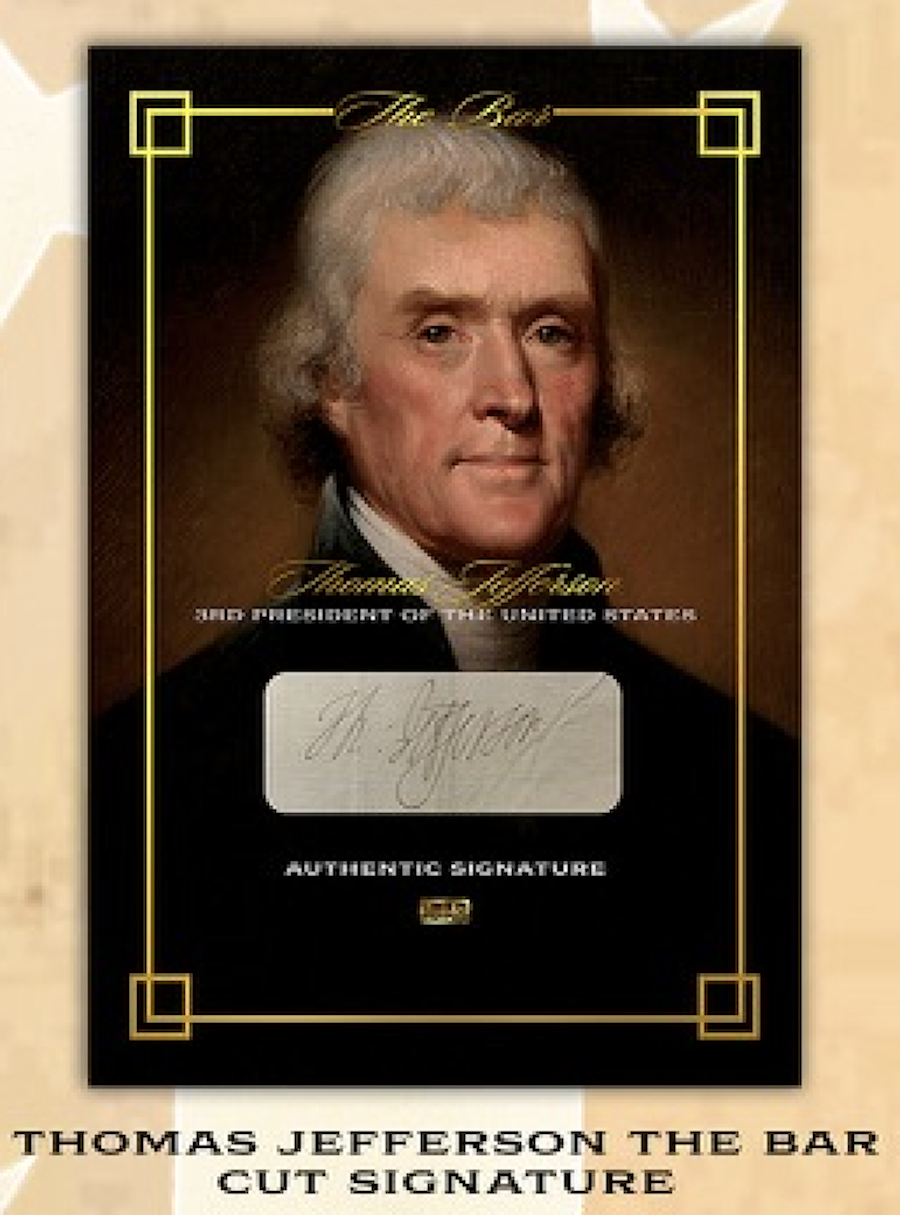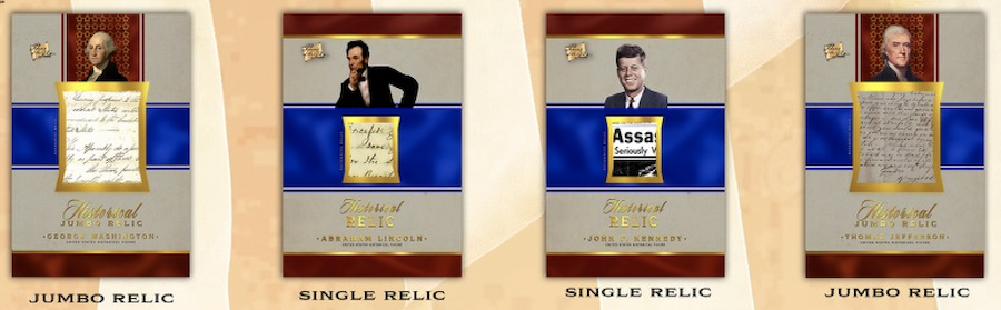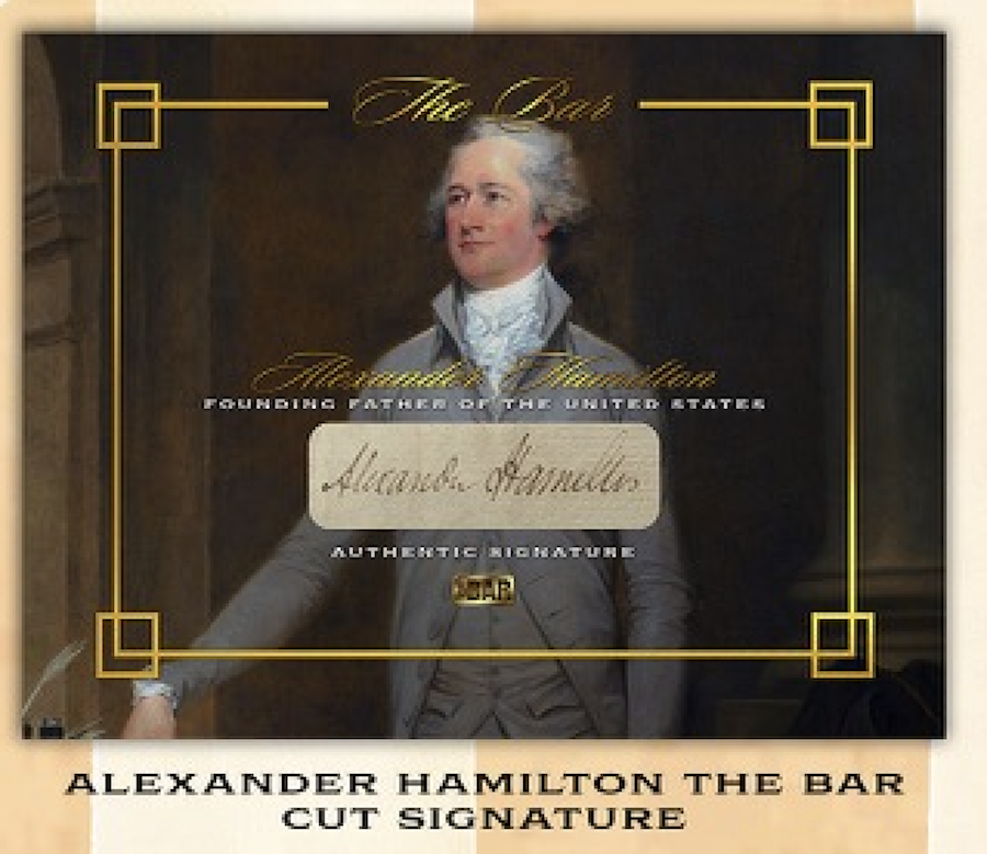 The Basics: Relics will be embedded into cards in this one and that will include singles, duals, triples, quads and jumbos for starters. There also will be cut documents, cut autos and "special 1/1 foils" for all subjects as well as The Bar 5-by-7 cut auto 1/1s. A small sampling of the possibilities is below. ... Boxes carry a suggested retail price of $64.95.